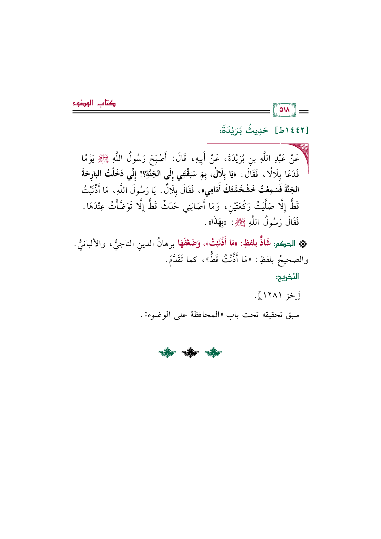 ◼ عَنْ عَبْدِ اللَّهِ بنِ بُرَيْدَةَ، عَنْ أَبِيهِ، قَالَ: أَصْبَحَ رَسُولُ اللَّهِ صلى الله عليه وسلم يَوْمًا فَدَعَا بِلَالًا، فَقَالَ: «يَا بِلَالُ، بِمَ سَبَقْتَنِي إِلَى الجَنَّةِ؟ ! إِنِّي دَخَلْتُ البَارِحَةَ الجَنَّةَ فَسَمِعْتُ خَشْخَشَتَكَ أَمَامِي»، فَقَالَ بِلَالٌ: يَا رَسُولَ اللَّهِ، مَا أَذْنَبْتُ قَطُّ إِلَّا صَلَّيْتُ رَكْعَتَيْنِ، وَمَا أَصَابَنِي حَدَثٌ قَطُّ إِلَّا تَوَضَّأْتُ عِنْدَهَا. فَقَالَ رَسُولُ اللَّهِ صلى الله عليه وسلم: «بِهَذَا».
