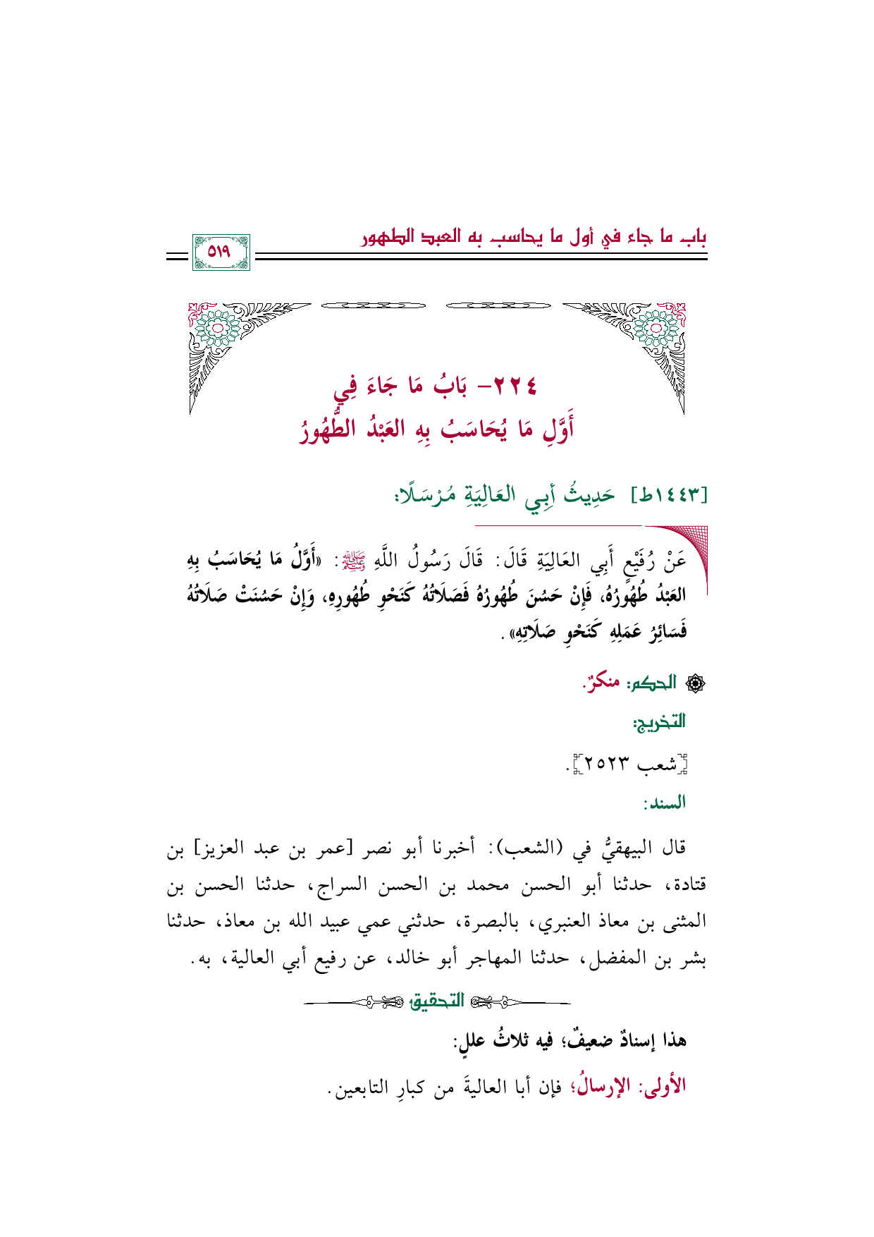 قال البيهقيُّ في (الشعب): أخبرنا أبو نصر [عمر بن عبد العزيز] بن قتادة، حدثنا أبو الحسن محمد بن الحسن السراج، حدثنا الحسن بن المثنى بن معاذ العنبري، بالبصرة، حدثني عمي عبيد الله بن معاذ، حدثنا بشر بن المفضل، حدثنا المهاجر أبو خالد، عن رفيع أبي العالية، به.