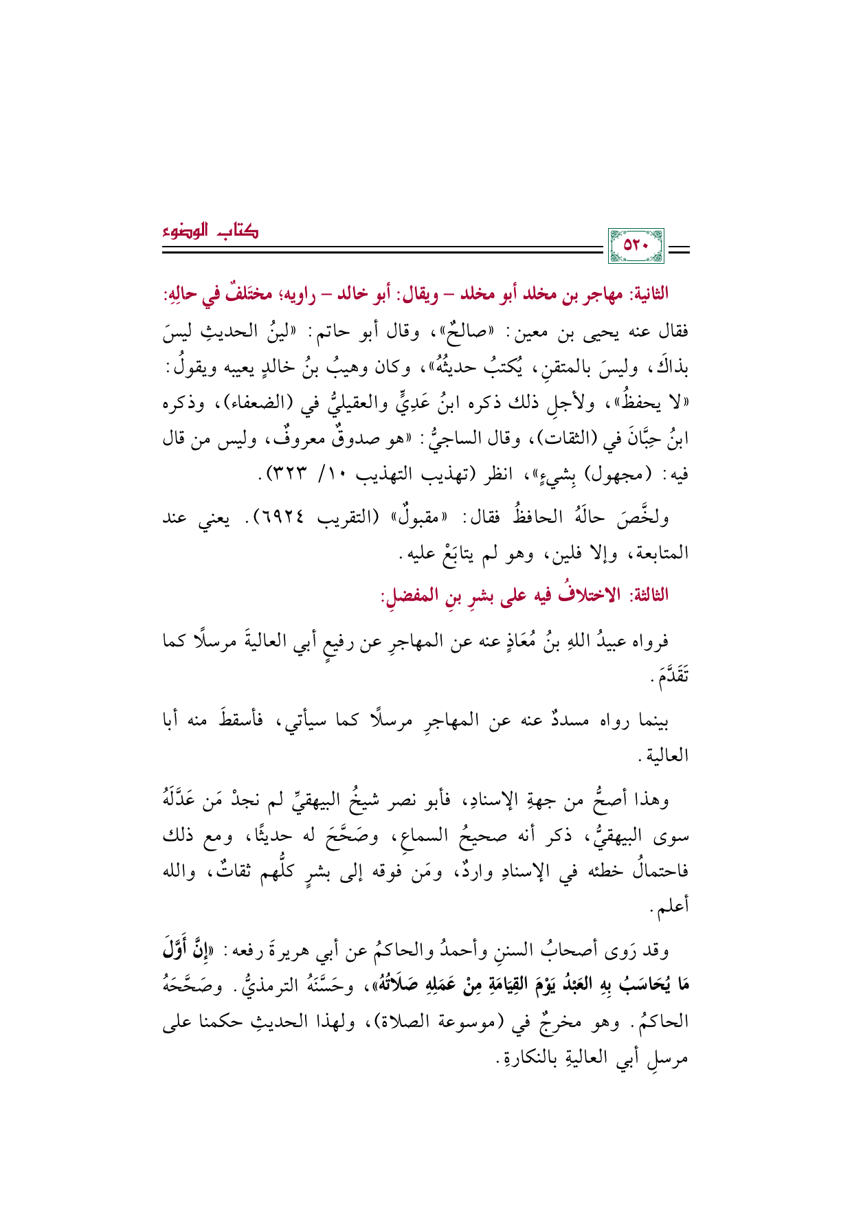 وقد رَوى أصحابُ السننِ وأحمدُ والحاكمُ عن أبي هريرةَ رفعه: «إِنَّ أَوَّلَ مَا يُحَاسَبُ بِهِ العَبْدُ يَوْمَ القِيَامَةِ مِنْ عَمَلِهِ صَلَاتُهُ»، وحَسَّنَهُ الترمذيُّ. وصَحَّحَهُ الحاكمُ. وهو مخرجٌ في (موسوعة الصلاة)، ولهذا الحديثِ حكمنا على مرسلِ أبي العاليةِ بالنكارةِ.
