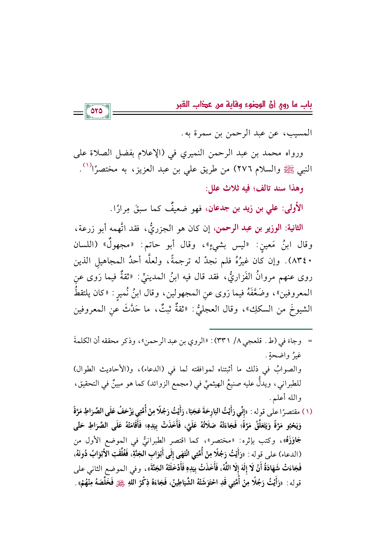 (¬١) مقتصرًا على قوله: «إِنِّي رَأَيْتُ البَارِحَةَ عَجَبًا، رَأَيْتُ رَجُلًا مِنْ أُمَّتِي يَزْحَفُ عَلَى الصِّرَاطِ مَرَّةً وَيَحْبُو مَرَّةً وَيَتَعَلَّقُ مَرَّةً؛ فَجَاءَتْهُ صَلَاتُهُ عَلَيَّ، فَأَخَذَتْ بِيَدِهِ؛ فَأَقَامَتْهُ عَلَى الصِّرَاطِ حَتَّى جَاوَزَهُ»، وكتب بإثره: "مختصر"، كما اقتصر الطبرانيُّ في الموضع الأول من (الدعاء) على قوله: «رَأَيْتُ رَجُلًا مِنْ أُمَّتِي انْتَهَى إِلَى أَبْوَابِ الجَنَّةِ، فَغُلِّقَتِ الأبْوَابُ دُونَهُ، فَجَاءَتْ شَهَادَةُ أَنْ لَا إِلَهَ إِلَا اللَّهُ، فَأَخَذَتْ بِيَدِهِ فَأَدْخَلَتْهُ الجَنَّةَ»، وفي الموضع الثاني على قوله: «رَأَيْتُ رَجُلًا مِنْ أُمَّتِي قَدِ احْتَوَشَتْهُ الشَّيَاطِينُ، فَجَاءَهُ ذِكْرُ اللهِ عَزَّ وَجَلَّ فَخَلَّصَهُ مِنْهُمْ».