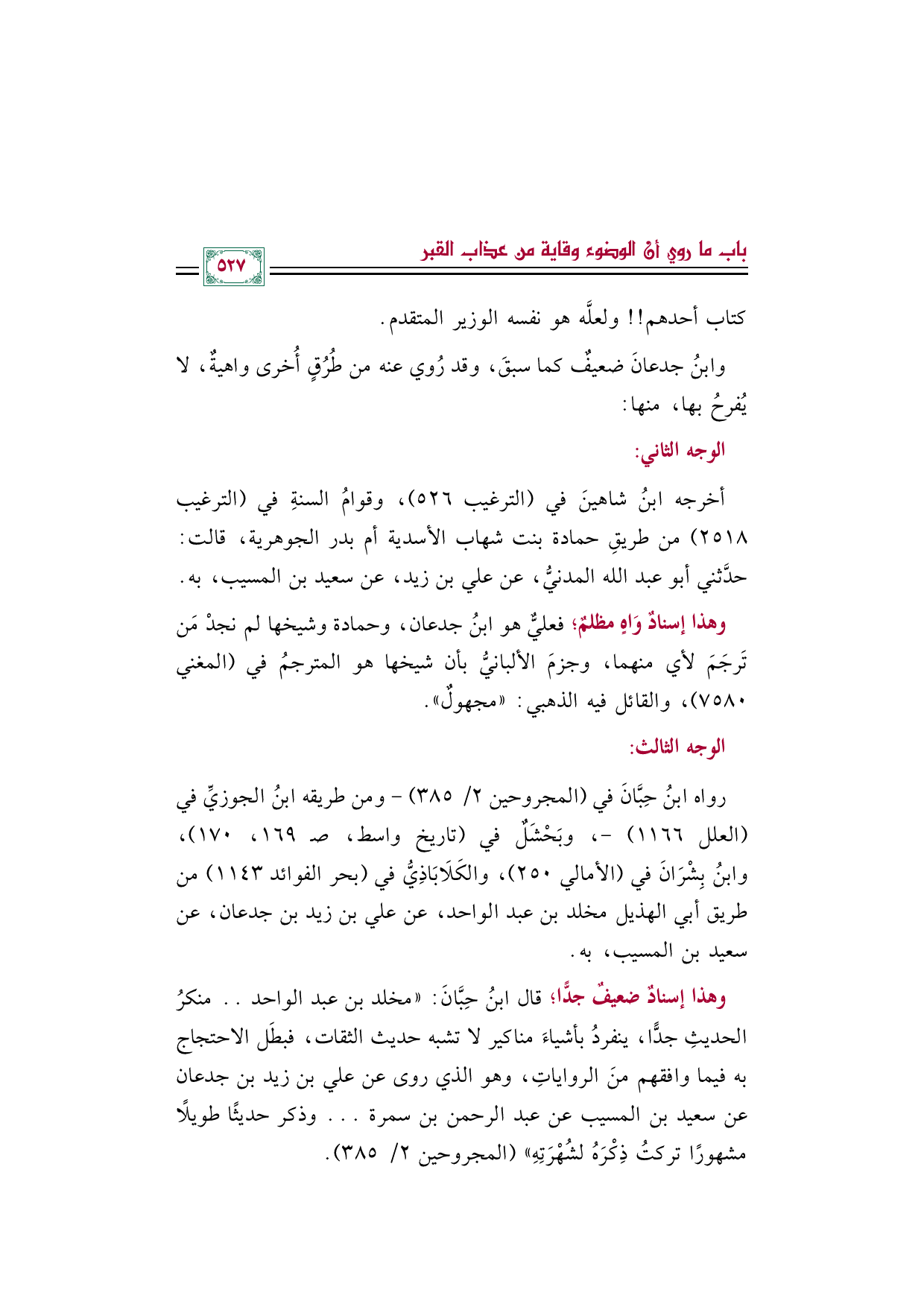 رواه ابنُ حِبَّانَ في (المجروحين ٢/ ٣٨٥) -ومن طريقه ابنُ الجوزيِّ في (العلل ١١٦٦) -، وبَحْشَلٌ في (تاريخ واسط، صـ ١٦٩، ١٧٠)، وابنُ بِشْرَانَ في (الأمالي ٢٥٠)، والكَلَابَاذِيُّ في (بحر الفوائد ١١٤٣) من طريق أبي الهذيل مخلد بن عبد الواحد، عن علي بن زيد بن جدعان، عن سعيد بن المسيب، به.