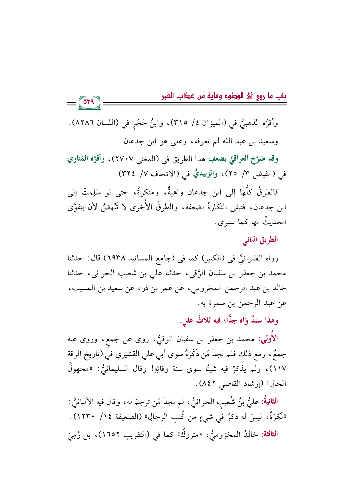 وقد صَرَّحَ العراقيُّ بضعفِ هذا الطريق في (المغني ٢٧٠٧)، وأقرَّه المُناوي في (الفيض ٣/ ٢٥)، والزبيديُّ في (الإتحاف ٧/ ٣٢٤).