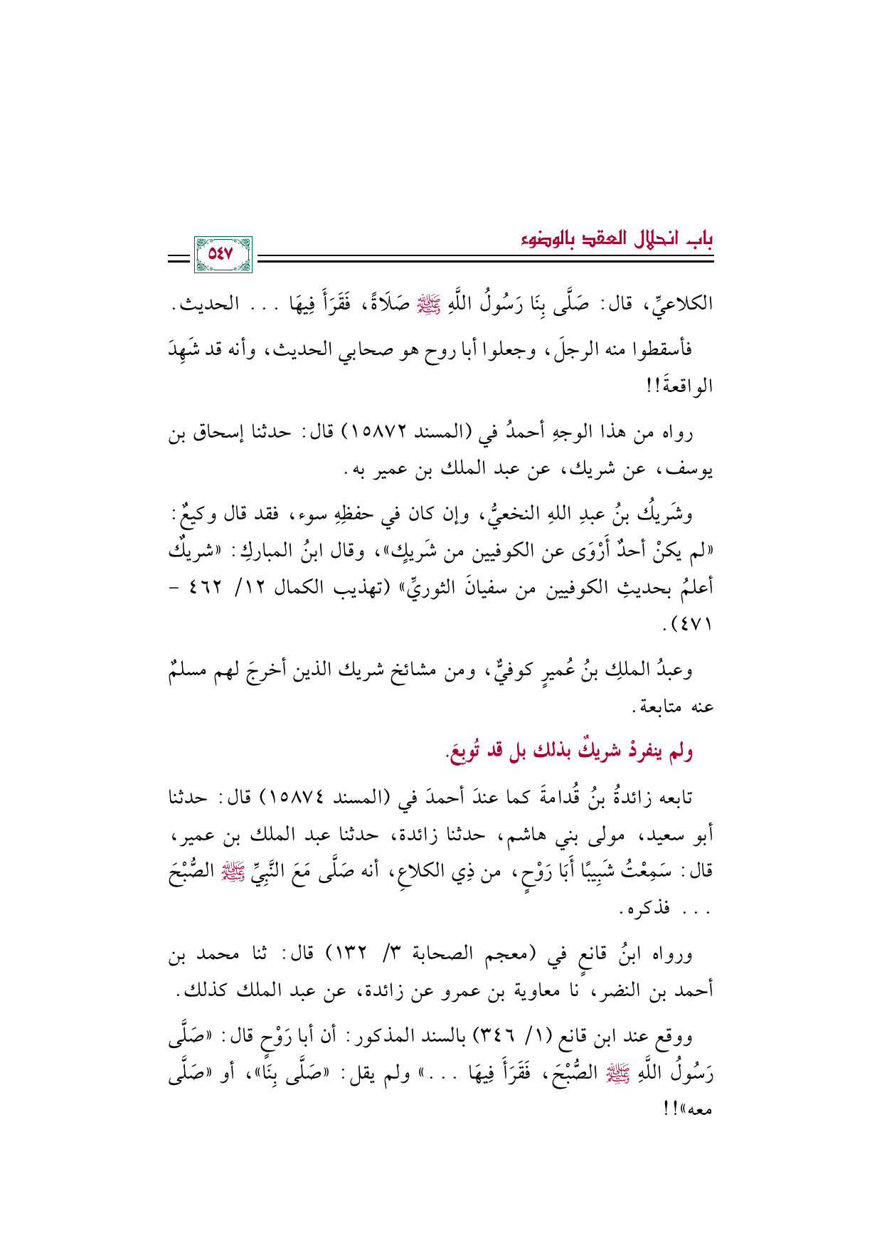 ووقع عند ابن قانع (١/ ٣٤٦) بالسند المذكور: أن أبا رَوْحٍ قال: ((صَلَّى رَسُولُ اللَّهِ صلى الله عليه وسلم الصُّبْحَ، فَقَرَأَ فِيهَا ... )) ولم يقل: "صَلَّى بِنَا"، أو "صَلَّى معه"! !