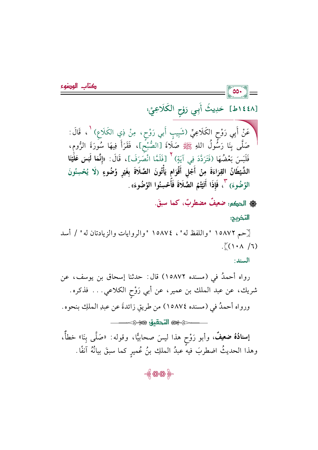 إسنادُهُ ضعيفٌ، وأبو رَوْحٍ هذا ليسَ صحابيًّا، وقوله: "صَلَّى بِنَا" خطأٌ، وهذا الحديثُ اضطربَ فيه عبدُ الملكِ بنُ عُميرٍ كما سبقَ بيانُهُ آنفًا.