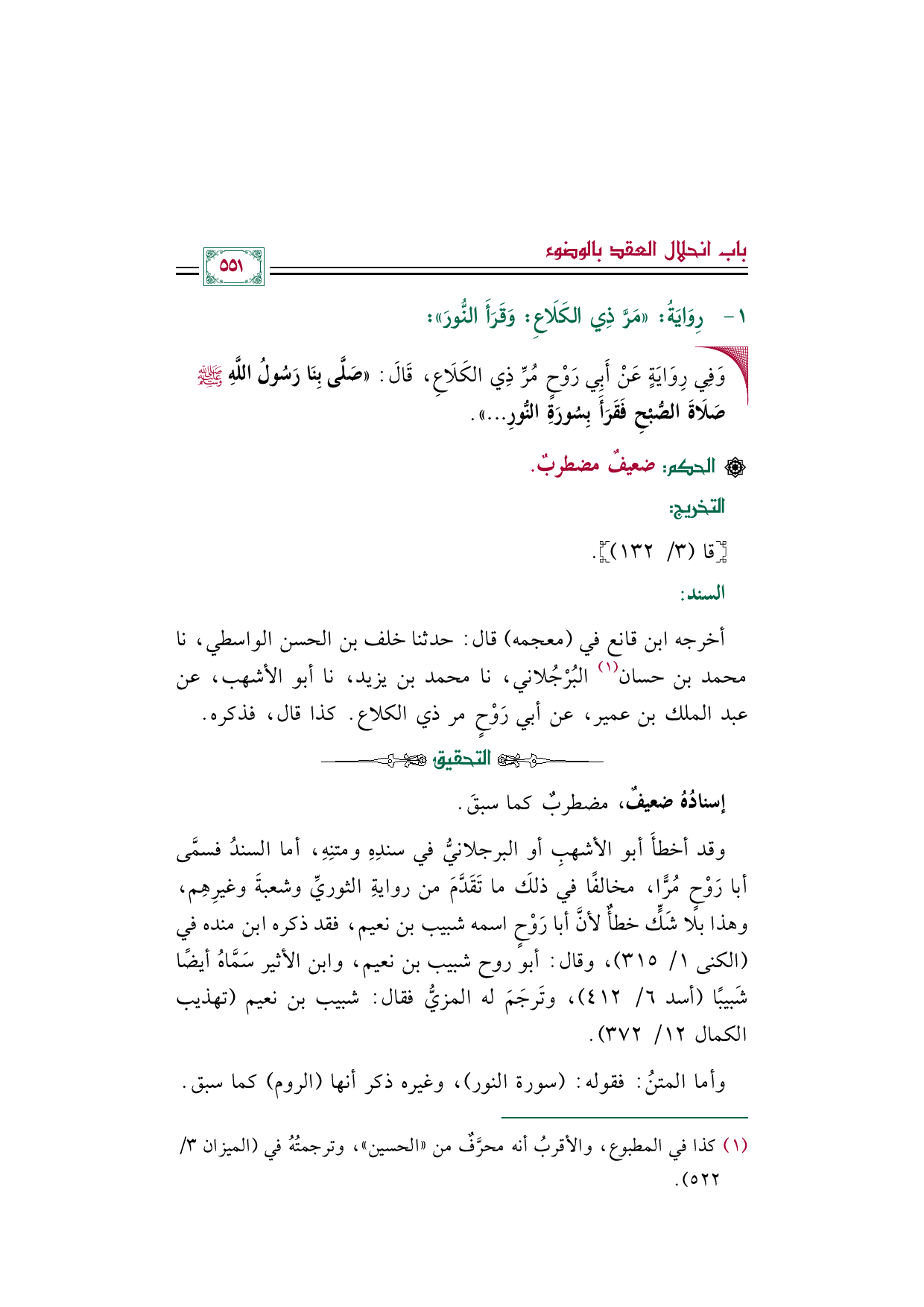 وقد أخطأَ أبو الأشهبِ أو البرجلانيُّ في سندِهِ ومتنِهِ، أما السندُ فسمَّى أبا رَوْحٍ مُرًّا، مخالفًا في ذلكَ ما تَقَدَّمَ من روايةِ الثوريِّ وشعبةَ وغيرِهِم، وهذا بلا شَكٍّ خطأٌ لأنَّ أبا رَوْحٍ اسمه شبيب بن نعيم، فقد ذكره ابن منده في (الكنى ١/ ٣١٥)، وقال: أبو روح شبيب بن نعيم، وابن الأثير سَمَّاهُ أيضًا شَبيبًا (أسد ٦/ ٤١٢)، وتَرجَمَ له المزيُّ فقال: شبيب بن نعيم (تهذيب الكمال ١٢/ ٣٧٢).