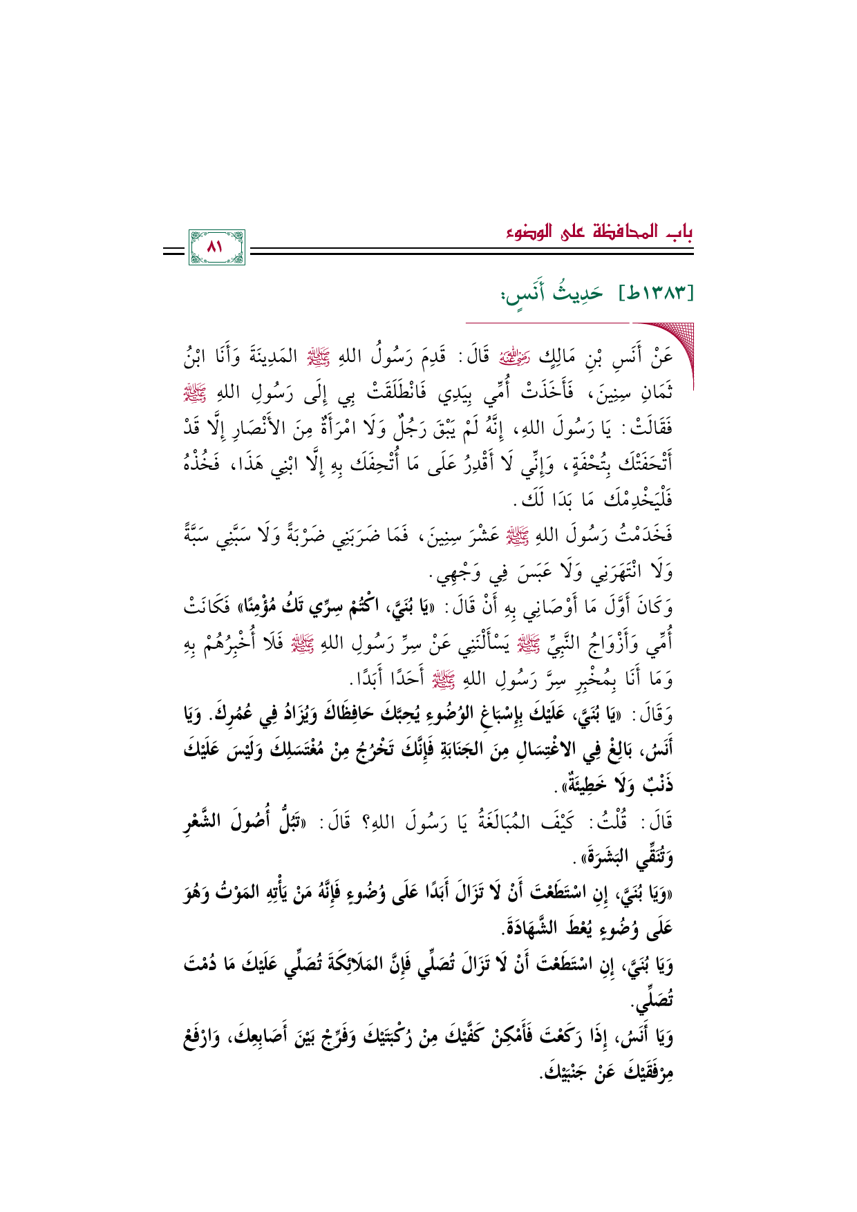 وَقَالَ: «يَا بُنَيَّ، عَلَيْكَ بِإِسْبَاغِ الوُضُوءِ يُحِبَّكَ حَافِظَاكَ وَيُزَادُ فِي عُمُرِكَ. وَيَا أَنَسُ، بَالِغْ فِي الاغْتِسَالِ مِنَ الجَنَابَةِ فَإِنَّكَ تَخْرُجُ مِنْ مُغْتَسَلِكَ وَلَيْسَ عَلَيْكَ ذَنْبٌ وَلَا خَطِيئَةٌ».