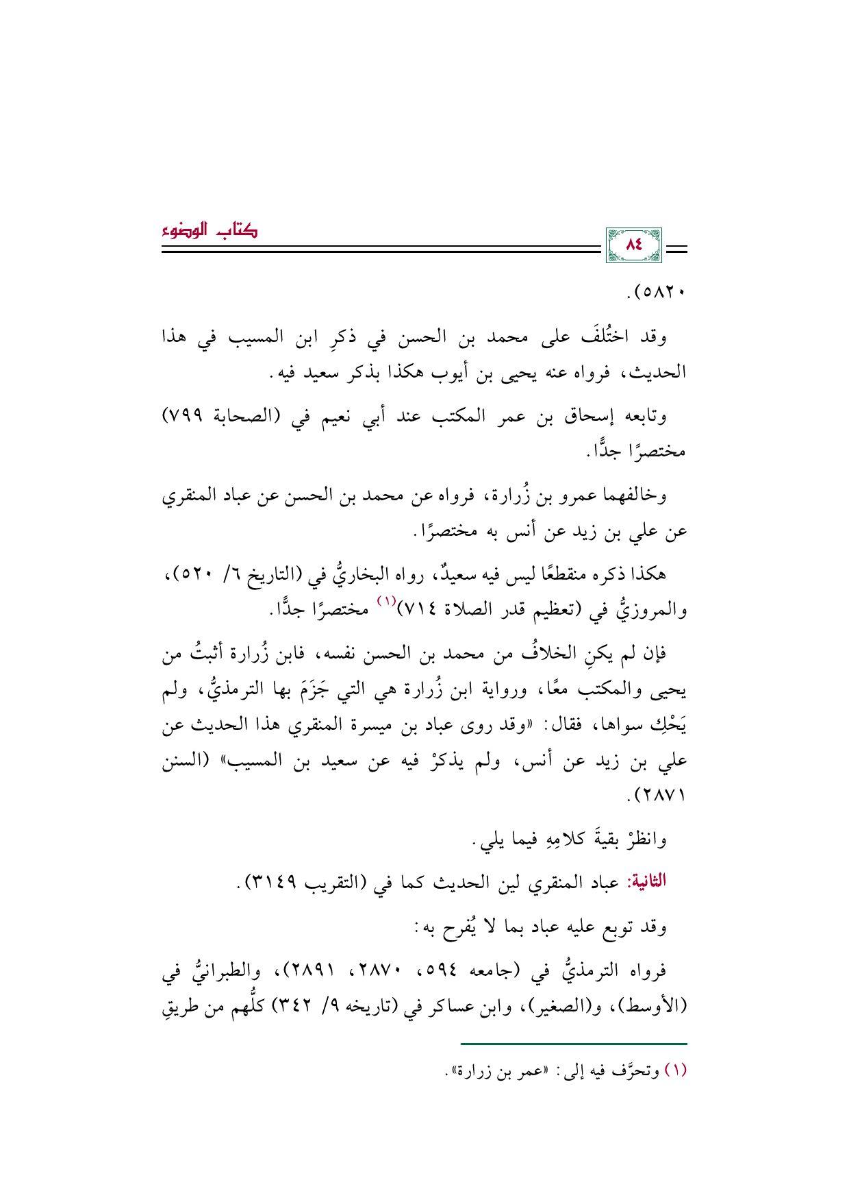 فإن لم يكنِ الخلافُ من محمد بن الحسن نفسه، فابن زُرارة أثبتُ من يحيى والمكتب معًا، ورواية ابن زُرارة هي التي جَزَمَ بها الترمذيُّ، ولم يَحْكِ سواها، فقال: "وقد روى عباد بن ميسرة المنقري هذا الحديث عن علي بن زيد عن أنس، ولم يذكرْ فيه عن سعيد بن المسيب" (السنن ٢٨٧١).