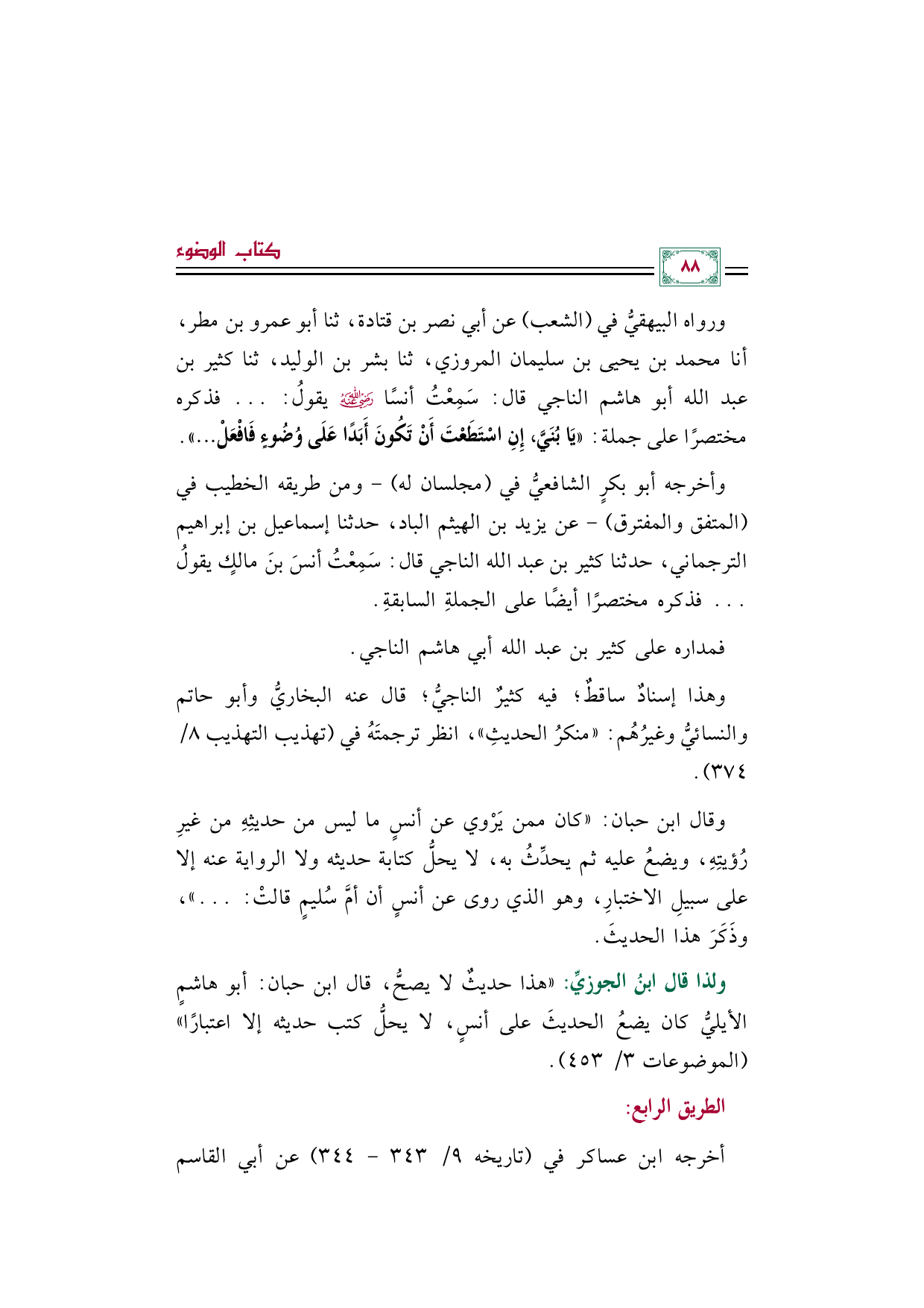 ورواه البيهقيُّ في (الشعب) عن أبي نصر بن قتادة، ثنا أبو عمرو بن مطر، أنا محمد بن يحيى بن سليمان المروزي، ثنا بشر بن الوليد، ثنا كثير بن عبد الله أبو هاشم الناجي قال: سَمِعْتُ أنسًا رضي الله عنه يقولُ: ... فذكره مختصرًا على جملة: «يَا بُنَيَّ، إِنِ اسْتَطَعْتَ أَنْ تَكُونَ أَبَدًا عَلَى وُضُوءٍ فَافْعَلْ ... ».