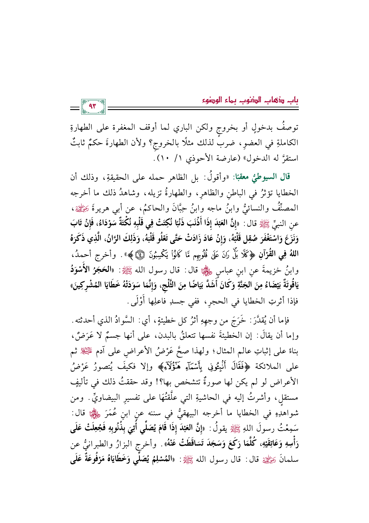 قال السيوطيُّ معقبًا: ((وأقولُ: بل الظاهر حمله على الحقيقةِ، وذلك أن الخطايا تؤثرُ في الباطنِ والظاهرِ، والطهارةُ تزيله، وشاهدُ ذلك ما أخرجه المصنِّفُ والنسائيُّ وابنُ ماجه وابنُ حِبَّانَ والحاكمُ، عن أبي هريرةَ رضي الله عنه، عنِ النبيِّ صلى الله عليه وسلم قال: «إِنَّ العَبْدَ إِذَا أَذْنَبَ ذَنْبًا نُكِتَتْ فِي قَلْبِهِ نُكْتَةٌ سَوْدَاءُ، فَإِنْ تَابَ وَنَزَعَ وَاسْتَغْفَرَ صُقِل قَلْبُهُ، وَإِنْ عَادَ زَادَتْ حَتَّى تَعْلُو قَلْبَهُ، وَذَلِكَ الرَّانُ، الَّذِي ذَكَرَهُ اللهُ فِي القُرْآنِ {كَلَّا بَلْ رَانَ عَلَى قُلُوبِهِمْ مَا كَانُوا يَكْسِبُونَ}». وأخرج أحمدُ، وابنُ خزيمةَ عنِ ابنِ عباسٍ رضي الله عنهما قال: قال رسول الله صلى الله عليه وسلم: «الحَجَرُ الأَسْوَدُ يَاقُوتَةٌ بَيْضَاءُ مِنَ الجَنَّةِ وَكَانَ أَشَدَّ بَيَاضًا مِنَ الثَّلْجِ، وَإِنَّمَا سَوَدَتْهُ خَطَايَا المُشْرِكِينَ» فإذا أثرتِ الخطايا في الحجرِ، ففي جسدِ فاعلِها أَوْلَى.