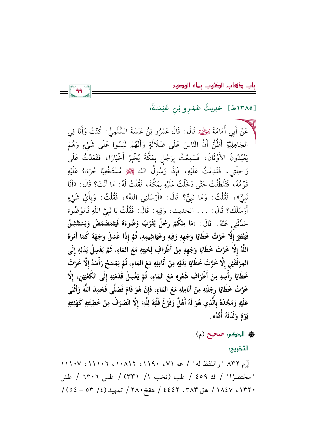 ◼ عَنْ أَبِي أُمَامَةَ رضي الله عنه قَالَ: قَالَ عَمْرُو بْنُ عَبَسَةَ السُّلَمِيُّ: كُنْتُ وَأَنَا فِي الجَاهِلِيَّةِ أَظُنُّ أَنَّ النَّاسَ عَلَى ضَلَالَةٍ وَأَنَّهُمْ لَيْسُوا عَلَى شَيْءٍ وَهُمْ يَعْبُدُونَ الأَوْثَانَ، فَسَمِعْتُ بِرَجُلٍ بِمَكَّةَ يُخْبِرُ أَخْبَارًا، فَقَعَدْتُ عَلَى رَاحِلَتِي، فَقَدِمْتُ عَلَيْهِ، فَإِذَا رَسُولُ اللهِ صلى الله عليه وسلم مُسْتَخْفِيًا جُرَءَاءُ عَلَيْهِ قَوْمُهُ، فَتَلَطَّفْتُ حَتَّى دَخَلْتُ عَلَيْهِ بِمَكَّةَ، فَقُلْتُ لَهُ: مَا أَنْتَ؟ قَالَ: «أَنَا نَبِيٌّ»، فَقُلْتُ: وَمَا نَبِيٌّ؟ قَالَ: «أَرْسَلَنِي اللهُ»، فَقُلْتُ: وَبِأَيِّ شَيْءٍ أَرْسَلَكَ؟ قَالَ: ... الحديث، وَفِيهِ: قَالَ: فَقُلْتُ يَا نَبِيَّ اللَّهِ فَالوُضُوءَ حَدِّثْنِي عَنْهُ. قَالَ: «مَا مِنْكُمْ رَجُلٌ يُقَرِّبُ وَضُوءَهُ فَيَتَمَضْمَضُ وَيَسْتَنْشِقُ فَيَنْتَثِرُ إِلَّا خَرَّتْ خَطَايَا وَجْهِهِ وَفِيهِ وَخَيَاشِيمِهِ، ثُمَّ إِذَا غَسَلَ وَجْهَهُ كَمَا أَمَرَهُ اللَّهُ إِلَّا خَرَّتْ خَطَايَا وَجْهِهِ مِنْ أَطْرَافِ لِحْيَتِهِ مَعَ المَاءِ، ثُمَّ يَغْسِلُ يَدَيْهِ إِلَى المِرْفَقَيْنِ إِلَّا خَرَّتْ خَطَايَا يَدَيْهِ مِنْ أَنَامِلِهِ مَعَ المَاءِ، ثُمَّ يَمْسَحُ رَأْسَهُ إِلَّا خَرَّتْ خَطَايَا رَأْسِهِ مِنْ أَطْرَافِ شَعْرِهِ مَعَ المَاءِ، ثُمَّ يَغْسِلُ قَدَمَيْهِ إِلَى الكَعْبَيْنِ، إِلَّا خَرَّتْ خَطَايَا رِجْلَيْهِ مِنْ أَنَامِلِهِ مَعَ المَاءِ، فَإِنْ هُوَ قَامَ فَصَلَّى فَحَمِدَ اللَّهَ وَأَثْنَى عَلَيْهِ وَمَجَّدَهُ بِالَّذِي هُوَ لَهُ أَهْلٌ وَفَرَّغَ قَلْبَهُ لِلَّهِ؛ إِلَّا انْصَرَفَ مِنْ خَطِيئَتِهِ كَهَيْئَتِهِ يَوْمَ وَلَدَتْهُ أُمُّهُ».