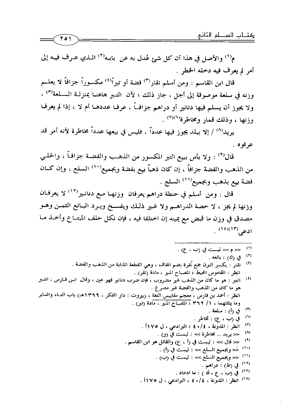 قال ابن القاسم: ومن أسلم نقار فضة أو تبراً مكسوراً جزافاً لا يعلم وزنه في سلعة موصوفة إلى أجل، جاز ذلك؛ لأن التبر هاهنا بمنزلة السلعة، ولا يجوز أن يسلم فيها دنانير أو دراهم جزافاً، عفا عددها أم لا، إذا لم يعرفا وزنها، وذلك قمار ومخاطرة.