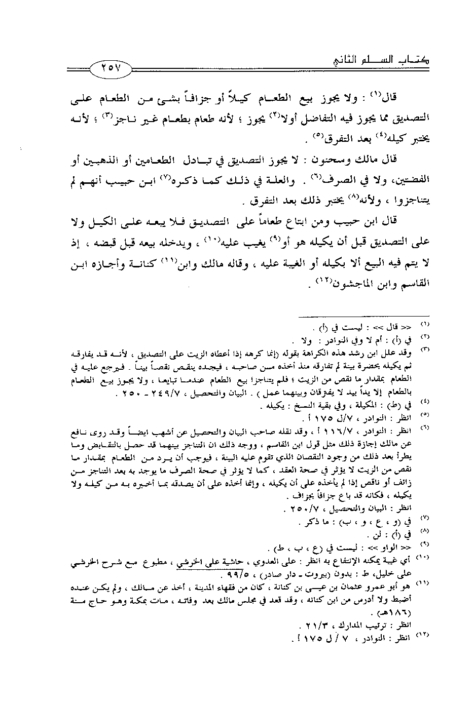 قال ابن حبيب ومن ابتاع طعاماً على التصديق فلا يبعه على الكيل ولا على التصديق قبل أن يكيله هو أو يغيب عليه، ويدخله بيعه قبل قبضه، إذ لا يتم فيه البيع الا بكيله أو الغيبة عليه، وقاله مالك وابن كنانة وأجازه ابن القاسم وابن الماجشون.