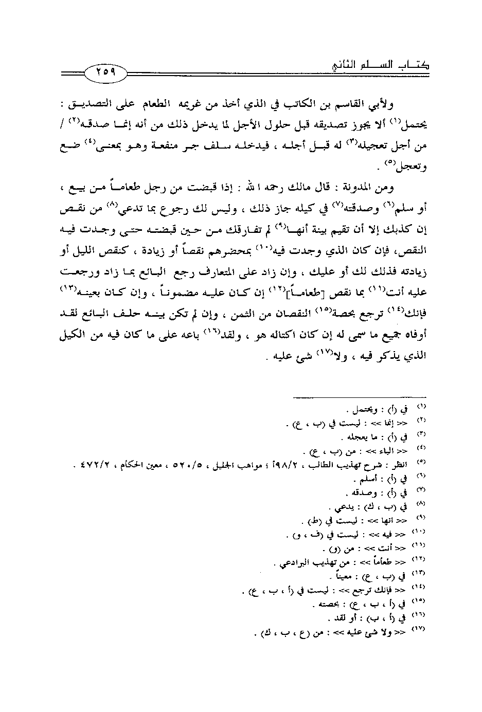 ولأبي القاسم بين الكاتب في الذي أخذ من غريمه الطعام على التصديق: يحتمل الا يجوز تصديقه قبل حلول الأجل لما يدخل ذلك من أنه إنما صدقه من أجل تعجيله له قبل أجله، فيدخله سلف جر منفعة وهو بمعنى ضع وتعجل.