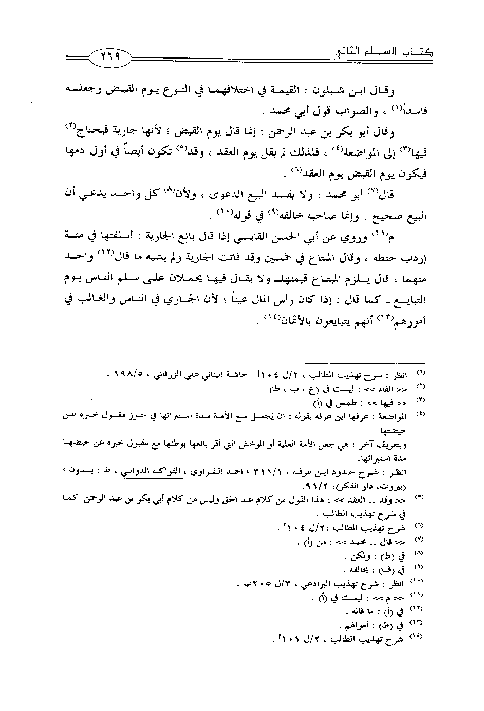 م وروي عن أبي الحسن القابسي إذا قال بائع الجارية: أسلفتها في مئة إردب حنطة، وقال المبتاع في خمسين وقد فاتت الجارية ولم يشبه ما قال واحد منهما، قال يلزم المبتاع قيمتها -ولا يقال فيها يحملان على سلم الناس يوم التبايع- كما قال: إذا كان رأس المال عيناً؛ لأن الجاري في الناس والغالب في أمورهم أنهم يتبايعون بالأثمان.