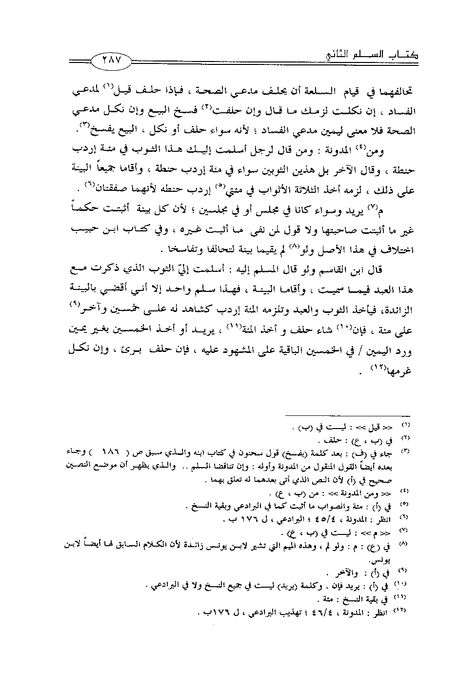 قال ابن القاسم ولو قال المسلم إليه: أسلمت إليّ الثوب الذي ذكرت مع هذا العبد فيما سميت، وأقاما البينة، فهذا سلم واحد إلا أني أقضي بالبينة الزائدة، فيأخذ الثوب والعبد وتلزمه المئة إردب كشاهد له على خمسين وآخر على مئة، فإن شاء حلف وأخذ المئة، يريد أو أخذ الخمسين بغير يمين ورد اليمين في الخمسين الباقية على المشهود عليه، فإن حلف برئ، وإن نكل غرمها.