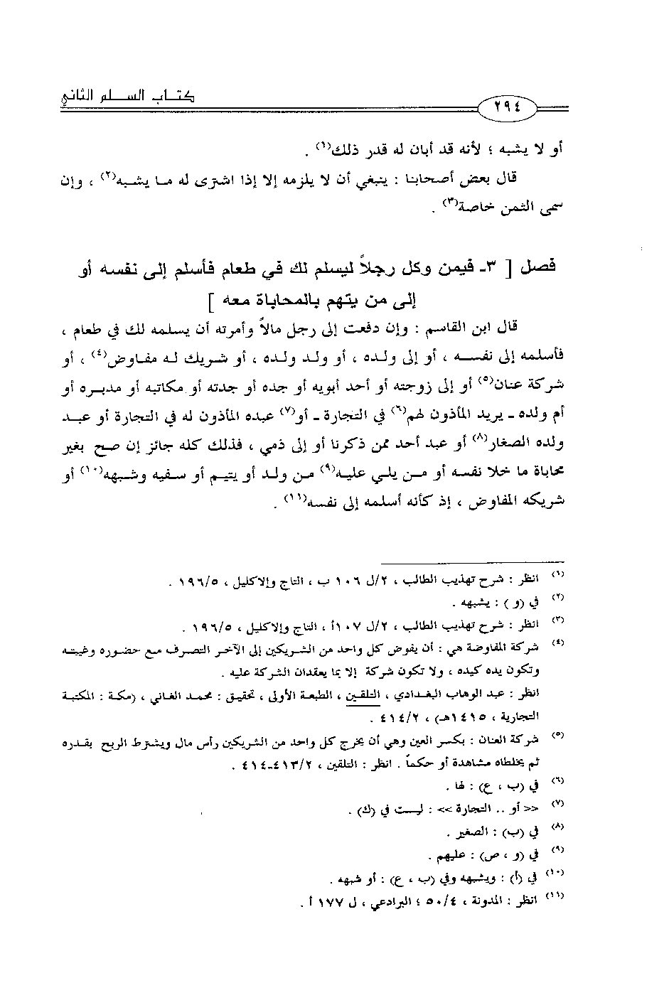 قال ابن القاسم: وإن دفعت إلى رجل مالاً وأمرته أن يسلمه لك في طعام، فأسلمه إلى نفسه، أو إلى ولده، أو ولد ولده، أو شريك له مفاوض، أو شركة عنان أو إلى زوجته أو أحد أبويه أو جده أو جدته أو مكاتبه أو مدبره أو أم ولده -يريد المأذون لهم في التجارة- أو عبده المأذون له في التجارة أو عبد ولده الصغار أو عبد أحد ممن ذكرنا أو إلى ذمي، فذلك كله جائز إن صح بغير محاباة ما خلا نفسه أو من يلي عليه من ولد أو يتيم أو سفيه وشبهه أو شريكه المفاوض، إذ كأنه أسلمه إلى نفسه.