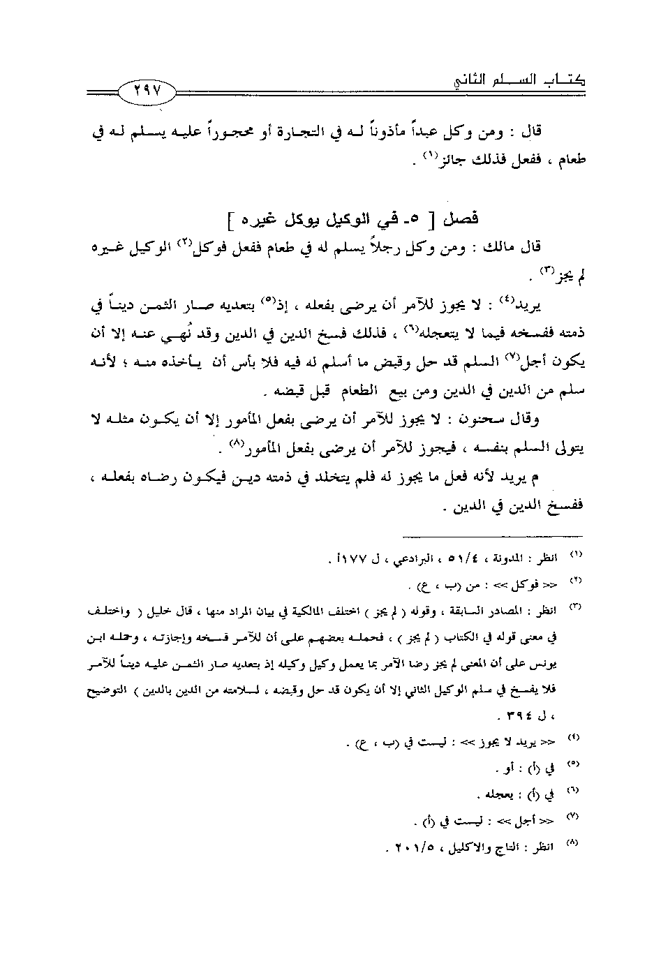 وقال سحنون: لا يجوز للآمر أن يرضى بفعل المأمور إلا أن يكون مثله لا يتولى السلم بنفسه، فيجوز للآمر أن يرضى بفعل المأمور.