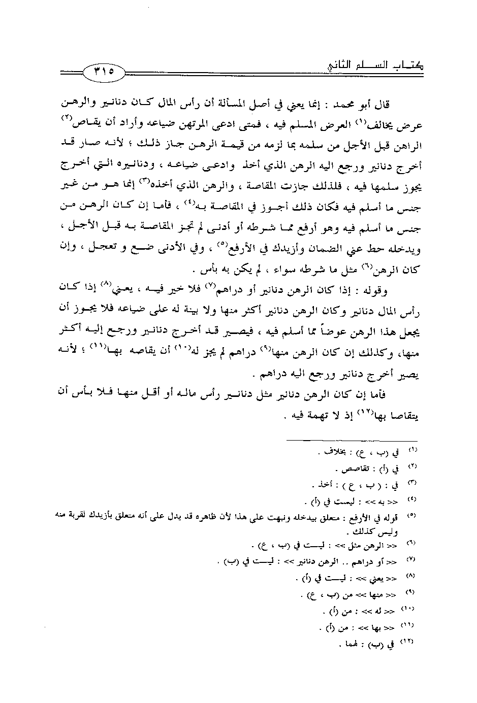 قال أبو محمد: إنما يعني في أصل المسألة أن رأس المال كان دنانير والرهن عرض يخالف العرض المسلم فيه، فمتى ادعى المرتهن ضياعه وأراد أن يقاص الراهن قبل الأجل من سلمه بما لزمه من قيمة الرهن جازم ذلك؛ لأنه صار قد أخرج دنانير ورجع إليه الرهن الذي أخذ وادعى ضياعه، ودنانيره التي أخرج يجوز سلمها فيه، فلذلك جازت المقاصة، والرهن الذي أخذه إنما هو من غير جنس ما أسلم فيه فكان ذلك أجوز في المقاصة به، فأما إن كان الرهن من جنس ما أسلم فيه وهو أرفع مما شرطه أو أدنى لم تجز المقاصة به قبل الأجل، ويدخله حط عني الضمان وأزيدك في الأرفع، وفي الأدنى ضع وتعجل، وإن كان الرهن مثل ما شرطه سواء، لم يكن به بأس.