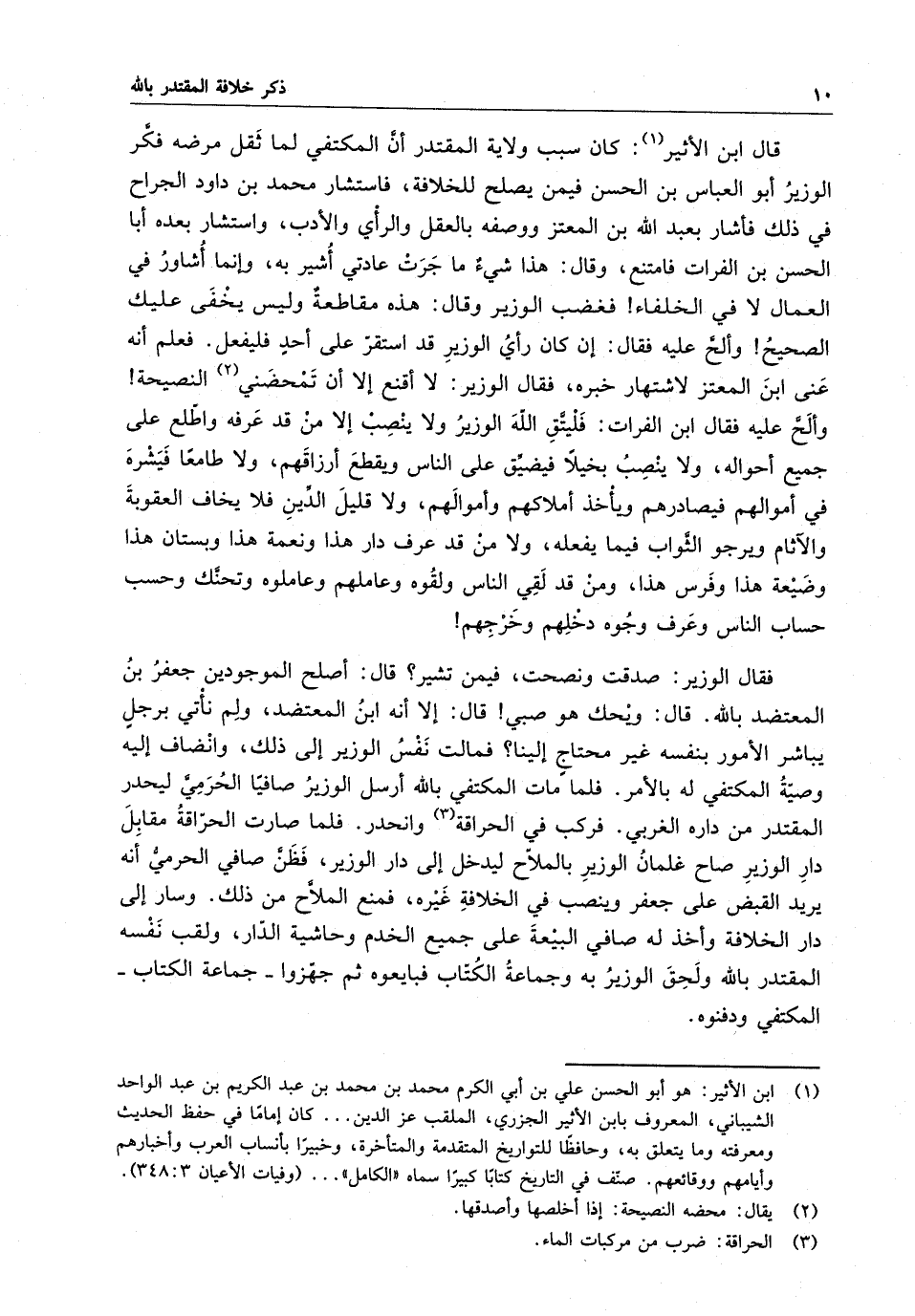 فعلم أنه عنى ابن المعتز لاشتهار خبره ، فقال الوزير : لا أقنع إلا أن تمحضني النصيحة وألح عليه فقال ابن الفرات : فليتق الله الوزير ولا ينصب إلا من قد عرفه واطلع على جميع أحواله ، ولا ينصبُ بخيلاً فيضيق على الناس ويقطع أرزاقهم ، ولا طامعاً فيشره في أموالهم فيصادرهم ويأخذ أملاكهم وأموالهم ، ولا قليل الدين فلا يخاف العقوبة والآثام ويرجو الثواب فيما يفعله ، ولا من قد عرف دار هذا ونعمة هذا وبستان هذا وضيعة هذا وفرس هذا ، ومن قد لقي الناس ولقوه وعاملهم وتحنك وحسب حساب الناس وعرف وجوه دخلهم وخرجهم فقال الوزير : صدقت ونصحت ، فيمن تشير ؟ قال أصلح الموجودين جعفر بن المعتضد بالله . قال : ويحك هو صبي قال : إلا أنه ابن المعتضد ، ولم نأتي برجلٍ يباشر الأمور بنفسه غير محتاجٍ إلينا ؟ فمالت نفسُ الوزير إلى ذلك ، وانضاف إليه وصية المكتفي له بالأمر . فلما مات المكتفي بالله أرسل الوزير صافياً الحرمي ليحدر المقتدر من داره الغربي .