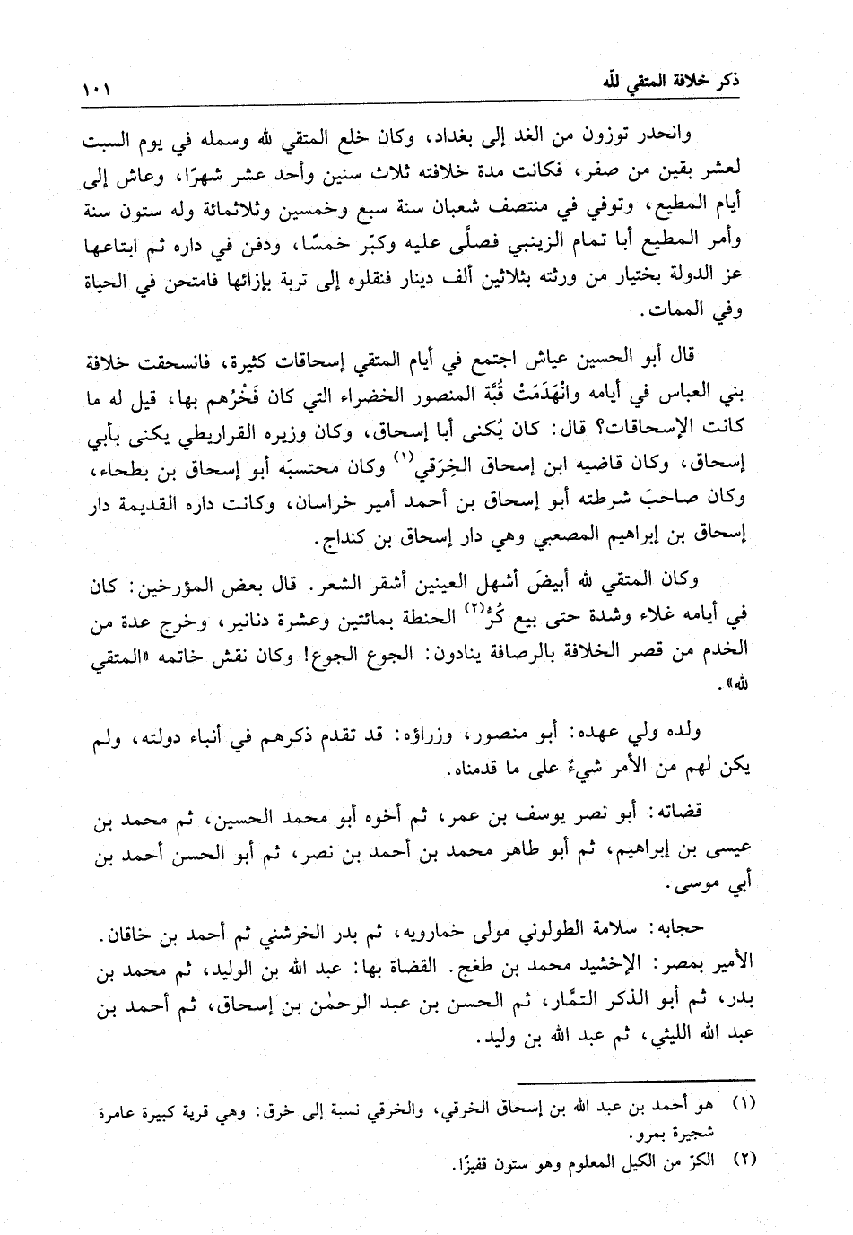 قال أبو الحسين عياش اجتمع في أيام المتقي إسحاقات كثيرة ، فانسحقت خلافة بني العباس في أيامه وانهدمت قبة المنصور الخضراء التي كان فخرهم بها ، قبل له ما كانت الإسحاقات ؟ قال : كان يكنى أبا إسحاق ، وكان وزير القراريطي يكنى بأبي إسحاق ، وكان قاضيه ابن إسحاق الخرقي وكان محتسبه أبو إسحاق بن بطحاء ، وكان صاحب شرطته أبو إسحاق بن أحمد أمير خراسان وكانت داره القديمة دار إسحاق بن إبراهيم المعصبي وهي دار إسحاق ابن كنداج .