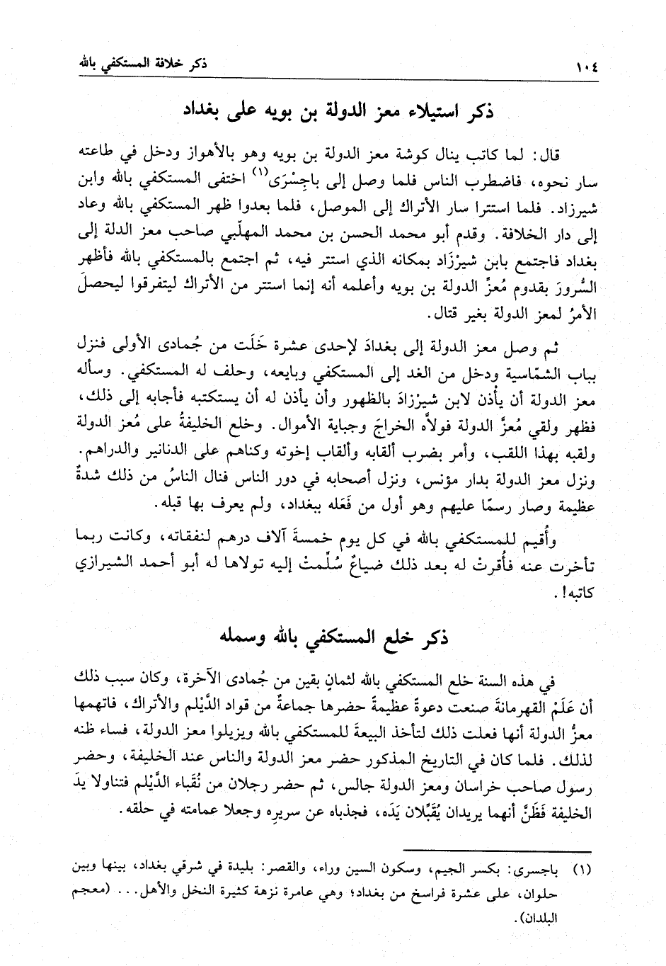ثم وصل معز الدولة إلى بغداد لإحدى عشرة خلت من جمادى الأولى فنزل بباب الشماسية ودخل من الغد إلى المستكفي وبايعه ، وحلف له المستكفي . وسأله معز الدولة أن يأذن لابن شيرزاد بالظهور وأن يأذن له أن يستكتبه فأجابه إلى ذلك ، فظهر ولقي معز الدولة فولاه الخراج وجباية الأموال . وخلع الخليفة على معز الدولة ولقبه بهذا اللقب ، وأمر بضرب ألقابه إخوته وكناهم على الدنانير والدراهم ونزل معز الدولة بدار مؤنس ، ونزل أصحابه في دور الناس فنال الناس من ذلك شدة عظيمة وصار رسماً عليهم وهو أول من فعله ببغداد ، ولم يعرف بها قبله .