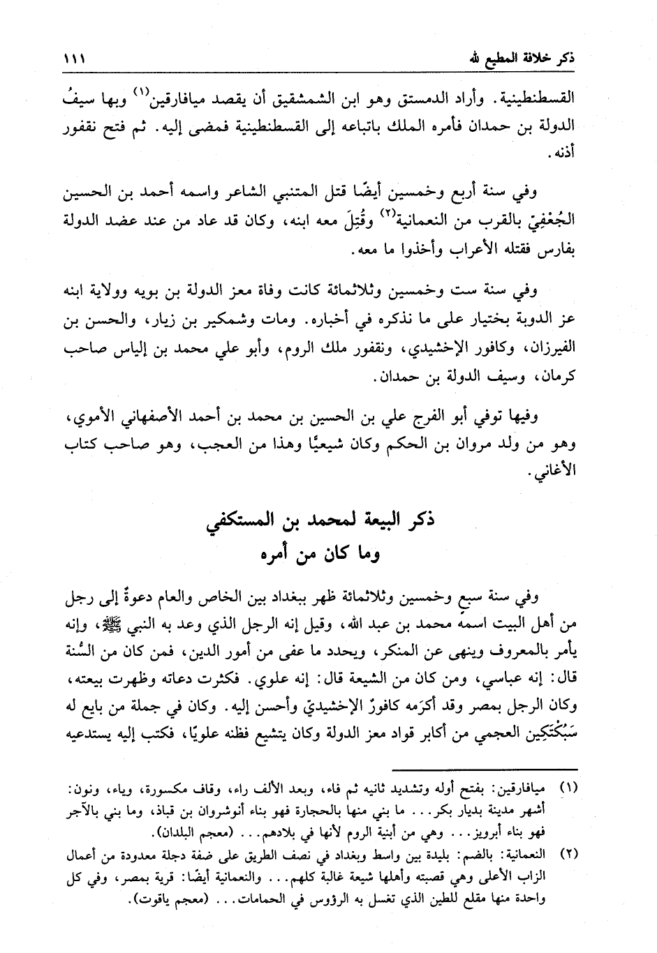القسطنطينية . وأراد الدمستق وهو ابن الشمشقيق أن يقصد ميافارقين وبها سيف الدولة بن حمدان فأمره الملك باتباعه إلى القسطنطينية فمضى إليه .