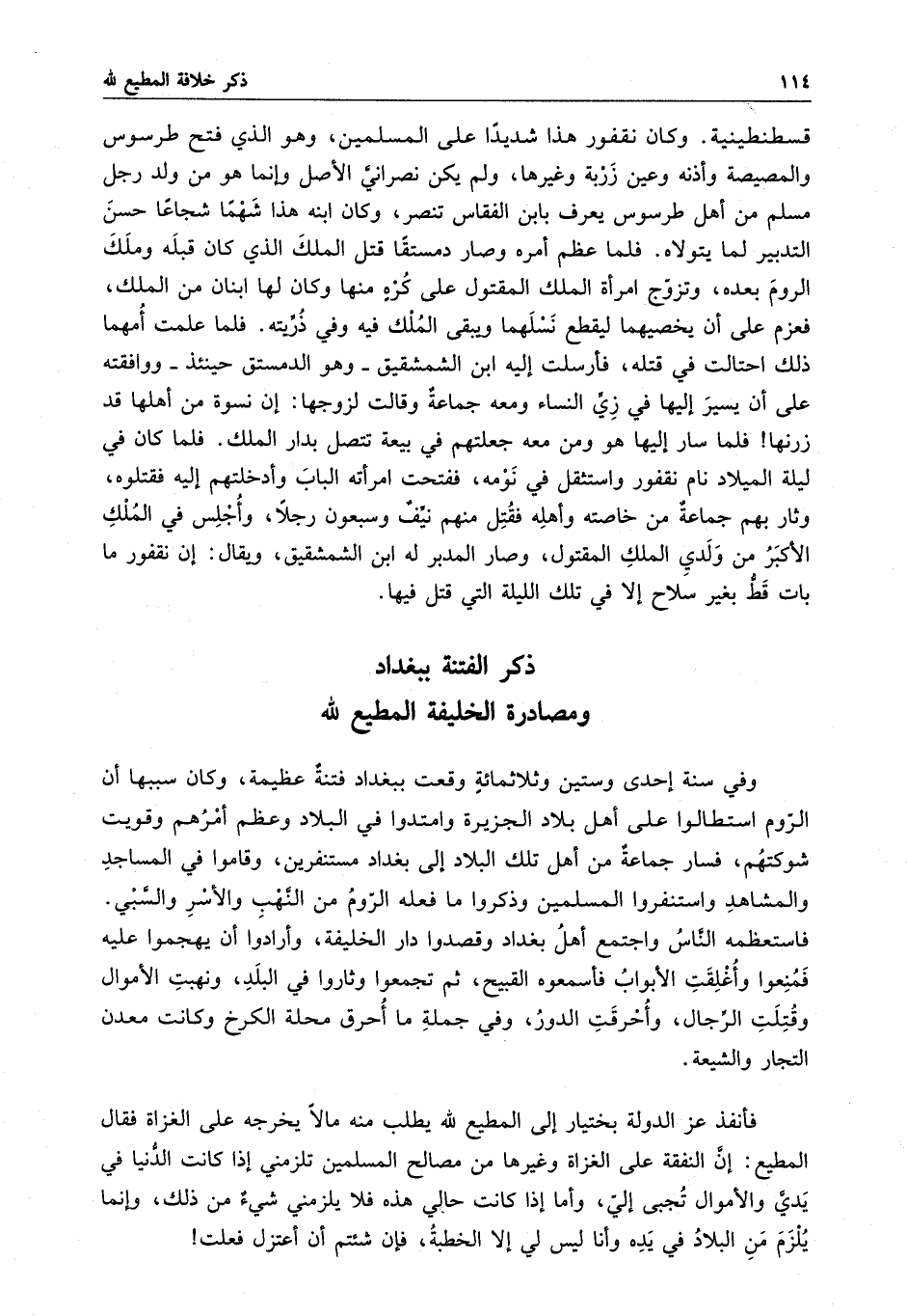 وفي سنة إحدى وستين وثلاثمائة وقعت ببغداد فتنة عظيمة ، وكان سببها أن الروم استطالوا على أهل بلاد الجزيرة وامتدوا في البلاد وعظم أمرهم وقويت شوكتهم ، فسار جماعة من أهل تلك البلاد إلى بغداد مستنفرين ، وقاموا في المساجد والمشاهد واستنفروا المسلمين وذكروا ما فعله الروم من النهب والأسر والسبي . فاستعظمه الناس واجتمع أهل بغداد وقصدوا دار الخليفة ، وأرادوا أن يهجموا عليه فمنعوا وأغلقت الأبواب فأسمعوه القبيح ، ثم تجمعوا وثاروا في البلد ، ونهبت الأموال وقتلت الرجال ، وأحرقت الدور ، وفي جملة ما أحرق محلة الكرخ وكانت معدن التجار والشيعة .