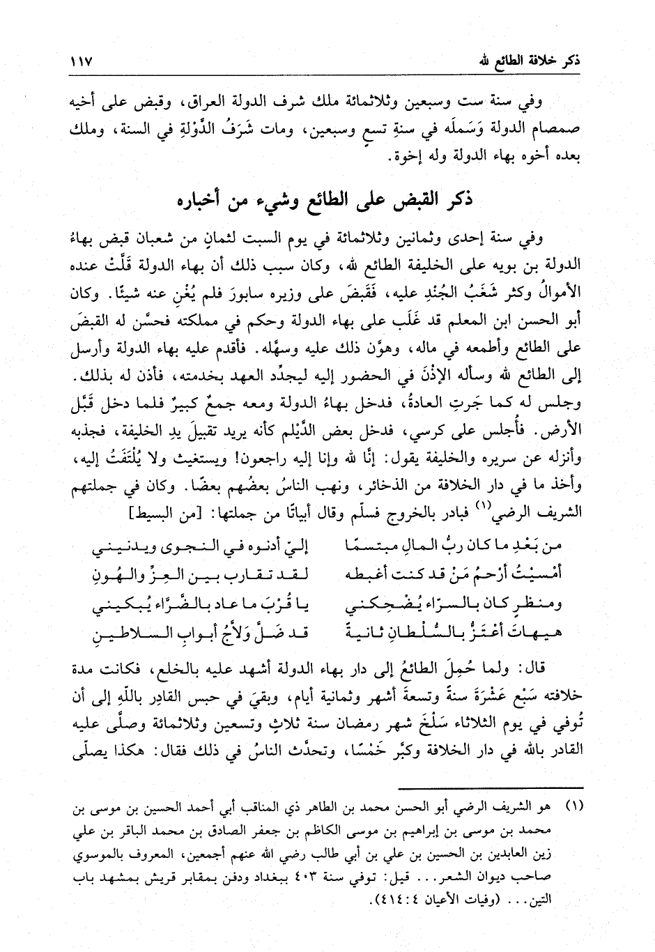 وفي سنة إحدى وثمانين وثلاثمائة في يوم السبت لثمان من شعبان قبض بهاء الدولة بن بويه على الخليفة الطائع لله ، وكان سبب ذلك أن بهاء الدولة قلت عنده الأموال وكثر شغب الجند عليه ، فقبض على وزيره سابور فلم يغن عنه شيئاً . وكان أبو الحسن بن المعلم قد غلب على بهاء الدولة وحكم في مملكته فحسن له القبض على الطائع وأطمعه في ماله ، وهون ذلك عليه وسهله . فأقدم عليه بهاء الدولة وأرسل إلى الطائع لله وسأله الإذن في الحضور إليه ليجدد العهد بخدمته ، فأذن له بذلك ، وجلس له كما جرت العادة ، فدخل بهاء الدولة ومعه جمع كبير فلما دخل قبل الأرض . فأجلس على كرسي ، فدخل بعض الديلم كأنه يريد تقبيل يد الخليفة ، فجذبه وأنزله عن سريره والخليفة يقول : إنا لله وإنا إليه راجعون ، ونهب الناس بعضهم بعضاً . وكان في جملتهم الشريف الرضي فبادر بالخروج فسلم وقال أبياتاً من جملتها :