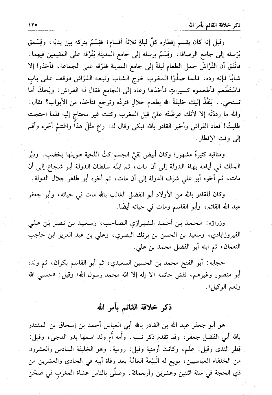 وقيل إنه كان يقسم إفطاره كل ليلة ثلاثة أقسام ، فقسم يتركه بين يديه ، وقسم يرسله إلى جامع الرصافة ، وقسم يرسله إلى جامع المدينة يفرقه على المقيمين فيهما . فاتفق أن الفراش حمل الطعام ليلة إلى جامع المدينة ففرقه على الجماعة ، فأخذوا إلا شاباً فإنه رده ، فلما صلوا المغرب خرج الشاب وتبعه الفراش فوقف على باب فاستطعم فأطعموه كسيرات فأخذها وعاد إلى الجامع فقال له الفراش : ويحك أما تستحي . . ينفذ إليك الخليفة الله بطعام حلال فترده وترجع فتأخذه من الأبواب ؟ فقال : والله فلما احتجت طلبت فعاد الفراش وأخبر القادر بالله فبكى وقال له : راع مثل هذا واغتنم أجره وأقم إلى وقت الإفطار . ومناقبه كثيرة مشهورة وكان أبيض نقي الجسم كث اللحية طويلها يخضب . ودبر الملك في أيامه بهاء الدولة إلى أن مات ، ثم ابنه سلطان الدولة أبو شجاع إلى أن مات ، ثم أخوه أبو علي شرف الدولة إلى أن مات ، ثم أخوه أبو طاهر جلال الدولة .