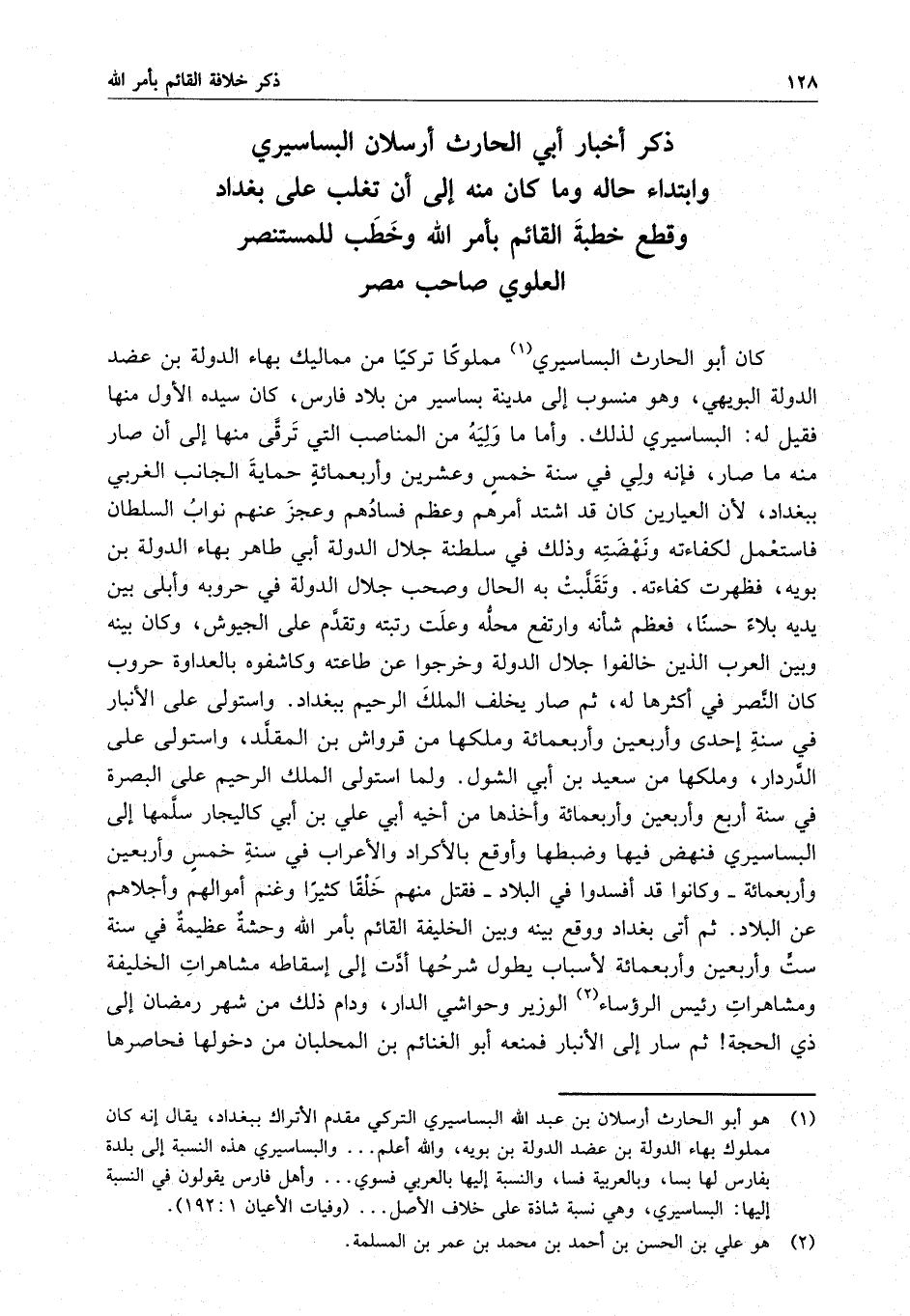 ذكر أخبار أبي الحارث أرسلان البساسيري وابتداء حاله وما كان منه إلى أن تغلب على بغداد وقطع خطبة القائم بأمر الله وخَطَب للمستنصر العلوي صاحب مصر