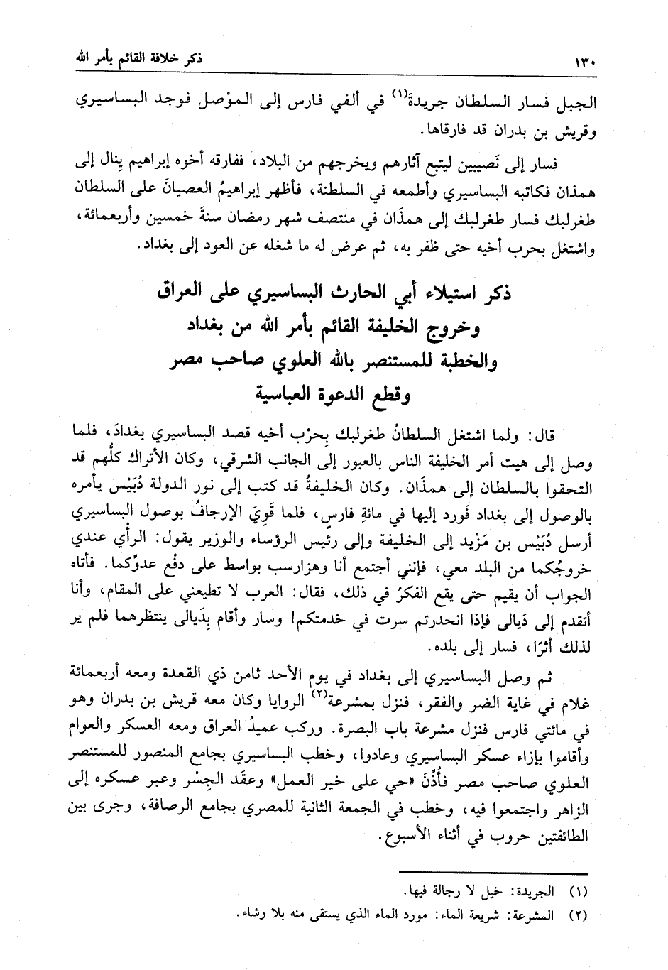 ثم وصل البساسيري إلى بغداد في يوم الأحد ثامن ذي القعدة ومعه أربعمائة غلام في غاية الضر والفقر ، فنزل مشرعة باب البصرة . وركب عميدُ العراق ومعه العسكر والعوام وأقاموا بإزاء عسكر البساسيري وعادوا ، وخطب البساسيري بجامع المنصور للمستنصر العلوي صاحب مصر فأذن حي على خير العمل وعقد الجسر وعبر عسكره إلى الثانية للمصري بجامع الرصافة ، وجرى بين الطائفتين حروب في أثناء الأسبوع .