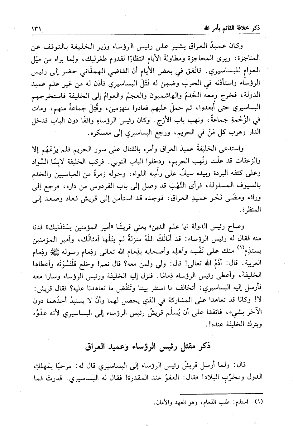 واستدعي الخليفة عميد العراق وأمره بالقتال على سور الحريم فلم يرعهم إلا والزعقات قد علت ونهب الحريم ، ودخلوا الباب النوبى . فركب الخليفة لابساً السواد وعلى كتفه البردة وبيده سيف على رأسه اللواء ، وحوله زمرة من العباسيين والخدم بالسيوف المسلولة ، فرأى النهب قد وصل إلى باب الفردوس من داره ، فرجع إلى ورائه ومضى نحو عميد العراق . فوجده قد استأمن إلى قريش فعاد وصعد إلى المنظرة . وصاح رئيس الدولة يا علم الدين يعني قريشاً أمير المؤمنين يستدنيك فدنا منه فقال له رئيس الرؤساء : قد أنالك الله منزلة لم ينلها أمثالك ، وأمير المؤمنين يستذم منك على نفسه وأهله وأصحابه بذمام الله تعالى وذمام رسوله ( صلى الله عليه وسلم ) وذمام العربية . قال : أذم الله تعالى قال : ولي ولمن معه ؟ قال نعم وخلع قلنسوته وأعطاها الخليفة ، وأعطى رئيس الرؤساء ذماماً . فنزل إليه الخليفة ورئيس الرؤساء وسارا معه فأرسل إليه اليساسيري : أتخالف ما استقر بيننا وتنقض ما تعاهدنا عليه ؟ فقال قريش لا وكانا قد تعاهدا على المشاركة في الذي يحصل لهما وأن لا يستبد أحدهما دون الآخر بشيء ، فاتفقا على أن يسلم قريش رئيس الرؤساء إلى البساسيري لأنه عدوه ويترك الخليفة عنده
