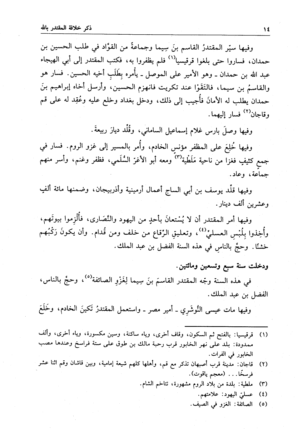 وفيها وصل بارس غلام إسماعيل الساماني ، وقلد ديار ربيعة وفيها خلع على المظفر مؤنس الخادم ، وأمر بالمسير إلى غزو الروم . فسار في جمع كثيف فغزا من ناحية ملطية ومعه أبو الأغر السلمي ، فظفر وغنم ، وأسر منهم جماعة ، وعاد .