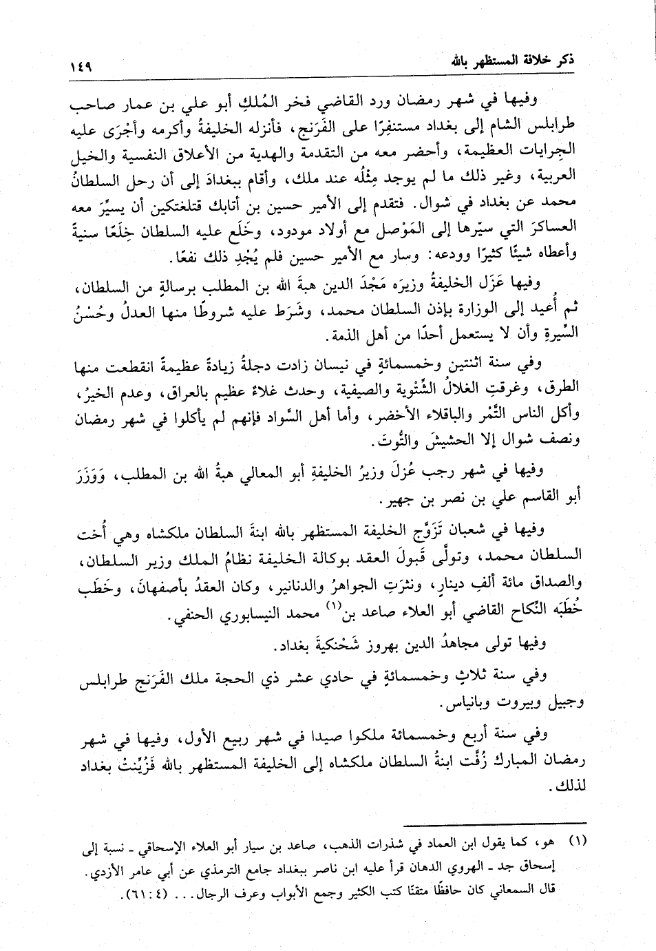 وفيها في شهر رمضان ورد القاضي فخر المُلك أبو علي بن عمار صاحب طرابلس الشام إلى بغداد مستنفراً على الفَرَنج ، فأنزله الخليفة وأكرمه وأجرى عليه الجِرايات العظيمة ، وأحضر معه من التقدمة والهدية من الأعلاق النفيسة والخيل العربية ، وغير ذلك ما لم يوجد مثله عند ملك ، وأقام ببغداد إلى أن رحل السلطان محمد عن بغداد في شوال . فتقدم إلى الأمير حسين بن أتابك قتلغتكين أن يسيّر معه العساكر التي سيّرها إلى المَوْصل مع أولاد مودود ، وخلع عليه السلطان خِلَعاً سنية وأعطاه شيئاً كثيراً وودعه : وسار مع الأمير حسين فلم يُجْدِ ذلك نفعاً .