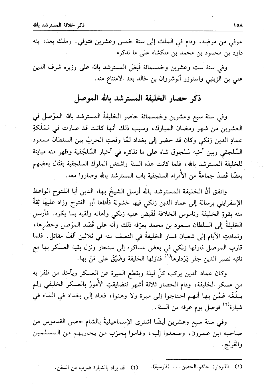 وفي سنة سبع وعشرين وخمسمائة حاصر الخليفة المسترشد بالله الموْصل في العشرين من شهر رمضان المبارك ، وسبب ذلك أنها كانت قد صارت في مملكة عماد الدين زنكي وكان قد حضر إلى بغداد لما وقعت الحرب بين السلطان مسعود السُّلجقي وبين أخيه سُلجوق شاه على ما نذكره في أخبار السلجقية وظهر منه مباينة للخليفة المسترشد بالله ، فلما كانت هذه السنة واشتغل الملوك السلجقية بقتال بعضهم بعضاً قصد جماعةٌ من الأمراء السلجقية باب المسترشد بالله وصاروا معه .