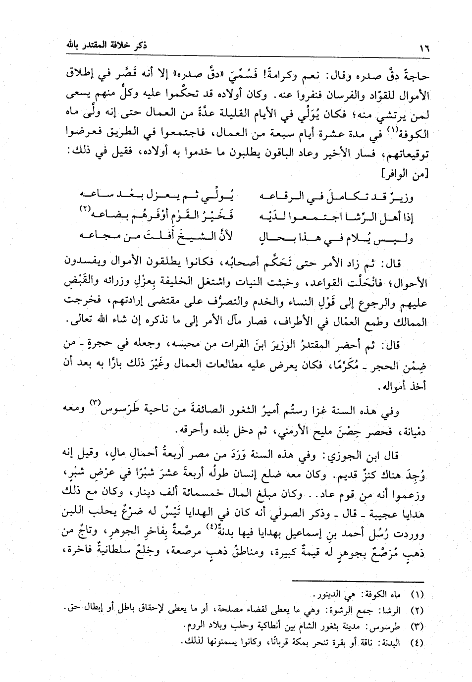 قال : ثم أحضر المقتدر الوزير ابن الفرات من محبسه وجعله في حجرةٍ - من ضمن الحجر - مكرماً ، فكان يعرض عليه مطالعات العمال وغير ذلك باراً به بعد أن أخذ أمواله . وفي هذه السنة غزا رستم أمير الثغور الصائفة من ناحية طرسوس ومعه دميانة ، فحصر حصن مليح الأرمني ، ثم دخل بلده وأحرقه .