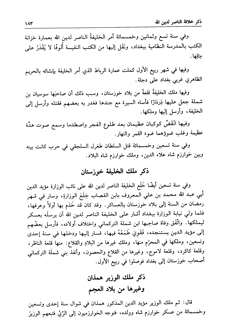 وفي سنة تسع وثمانين وخمسمائة أمر الخليفة الناصر لدين الله بعمارة خزانة الكتب بالمدرسة النظامية ببغداد ، ونقل إليها من الكتب النفيسة ألوفاً لا يُقدَر على مثلها .