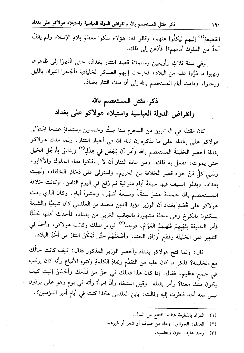 وفي سنة ثلاث وأربعين وستمائة قصد التتار بغداد ، حتى انتهوا إلى ظاهرها ونهبوا ما مرّوا عليه من البلاد ، فخرجت إليهم العساكر الخليفتية فأجّجوا النيران بالليل ورحلوا ، ودامت أيام المستعصم بالله إلى أن ملك التتار بغداد .