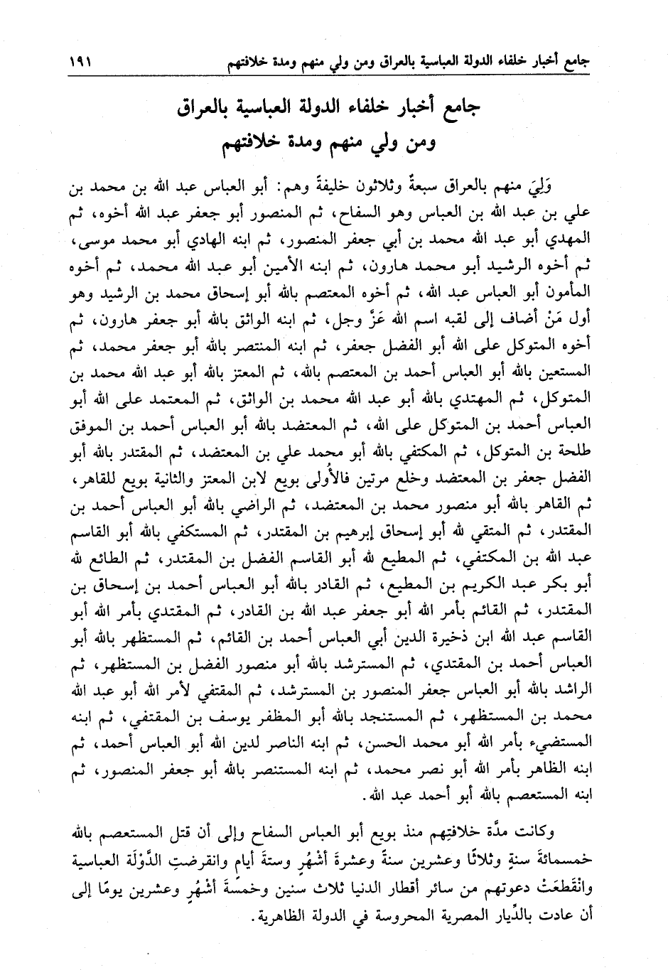 جامع أخبار خلفاء الدولة العباسية بالعراق ومن ولى منهم ومدة خلافتهم