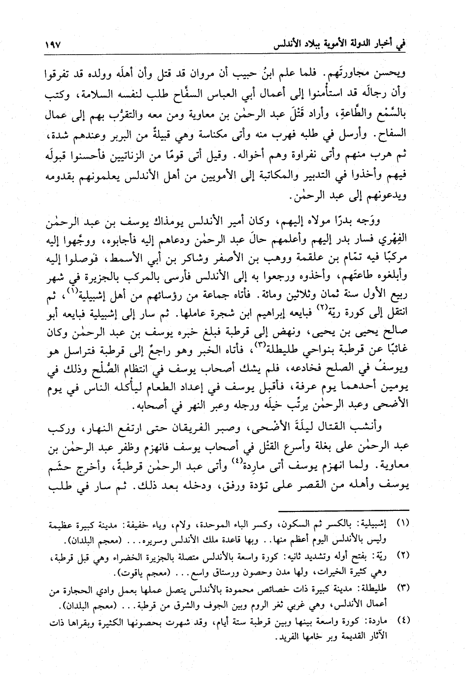 ويحسن مجاورتهم . فلما علم ابن حبيب أن مروان قد قتل وأن أهله وولده قد تفرقوا وأن رجاله قد استأمنوا إلى أعمال أبي العباس السفاح طلب لنفسه السلامة ، وكتب بالسمع والطاعة ، وأراد قتل عبد الرحمن بن معاوية ومن معه والتقرب بهم إلى عمال السفاح . وأرسل في طلبه فهرب منه وأتى مكناسة وهي قبيلة من البربر وعندهم شدة ، ثم هرب منهم وأتى نفراوة وهم أخواله . وقيل أتى قوماً من الزناتيين فأحسنوا قبوله فيهم وأخذوا في التدبير والمكاتبة إلى الأمويين من أهل الأندلس يعلموهم بقدومه ويدعونهم إلى عبد الرحمن . ووجه بدراً مولاه إليهم ، وكان أمير الأندلس يومذاك يوسف بن عبد الرحمن الفِهْري فسار بدر إليهم وأعلمهم حال عبد الرحمن ودعاهم إليه فأجابوه ، ووجّهوا إليه مركباً فيه تمّام بن علقمة ووهب بن الأصفر وشاكر بن أبي الأسمط ، فوصلوا إليه وأبلغوه طاعتهم ، وأخذوه ورجعوا به إلى الأندلس فأرسى بالمركب بالجزيرة في شهر ربيع الأول سنة ثمان وثلاثين ومائة . فأتاه جماعة من رؤسائهم من أهل إشبيلية ، ثم انتقل إلى كورة ريّة فبايعه إبراهيم بن شجرة عاملها . ثم سار إلى إشبيلية فبايعه أبو صالح يحيى بن يحيى ، ونهض إلى قرطبة فبلغ خبره يوسف بن عبد الرحمن وكان غائباً عن قرطبة بنواحي طليطلة ، فأتاه الخبر وهو راجعٌ إلى قرطبة فتراسل هو ويوسف في الصلح فخادعه ، فلم يشك أصحاب يوسف في انتظام الصُّلح وذلك في يومين أحدهما يوم عرفة ، فأقبل يوسف في إعداد الطعام ليأكله الناس في يوم الأضحى وعبد الرحمن يرتّب خيله ورجله وعبر النهر في أصحابه .
