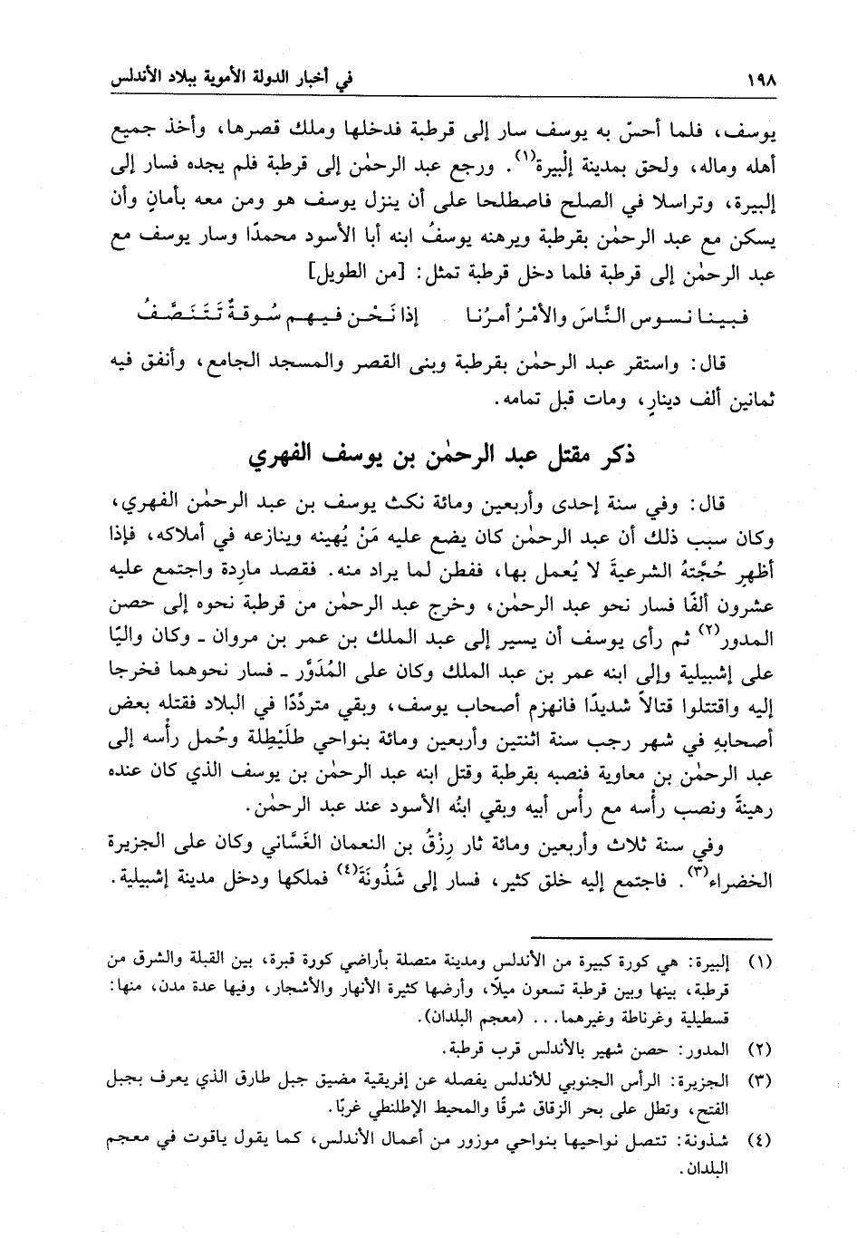قال : وفي سنة إحدى وأربعين ومائة نكث يوسف عبد الرحمن الفهري ، وكان سبب ذلك أن عبد الرحمن كان يضع عليه مَنْ يُهينه وينازع في أملاكه ، فإذا اظهر حُجّته الشرعية لا يُعمل بها ، ففطن لما يراد منه . فقصد مارِدة واجتمع عليه عشرون ألفاً فسار نحو عبد الرحمن ، وخرج عبد الرحمن من قرطبة نحوه إلى حصن المدور ثم رأى يوسف أن يسير إلى عبد الملك ابن عمر بن مروان - وكان والياً على إشبيلية وإلى ابنه عمر بن عبد الملك وكان على المُدوَّر - فسار نحوهما فخرجا إليه واقتتلوا قتالاً شديداً فانهزم أصحاب يوسف ، وبقيَ متردّداً في البلاد فقتله بعض أصحابه في شهر رجب سنة اثنتين وأربعين ومائة بنواحي طليطلة وحُمل رأسه إلى عبد الرحمن بن معاوية فنصبه بقرطبة وقتل ابنه عبد الرحمن بن يوسف الذي كان عنده رهينةً ونصب رأسه مع رأس أبيه وبقي ابنه الأسود عند عبد الرحمن .