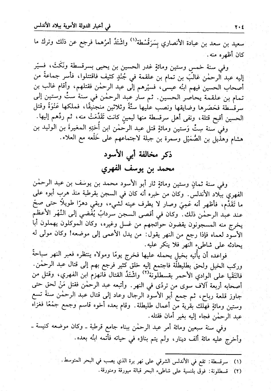 وفي سنة ثمان وستين ومائة ثار أبو الأسود محمد بن يوسف بن عبد الرحمن الفهري ببلاد الأندلس . وكان من خبره أنه كان في السجن بقرطبة منذ هرب أبوه على ما تقدّم ، فأظهر أنه عَميَ وصار لا يطرف عينه لشيء ، وبقي دهراً طويلاً حتى صح عند عبد الرحمن ذلك . وكان في أقصى السجن سرداب يُفضي إلى النهر الأعظم يخرج منه المسجونون يقضون حوائجهم من غسل وغيره ، وكان الموكلون يهملون أبا الأسود لعماه فإذا خرج من النهر يقول : من يدل الأعمى إلى موضعه وكان مولى له بحادثه على شاطئ النهر فلا ينكر عليه .