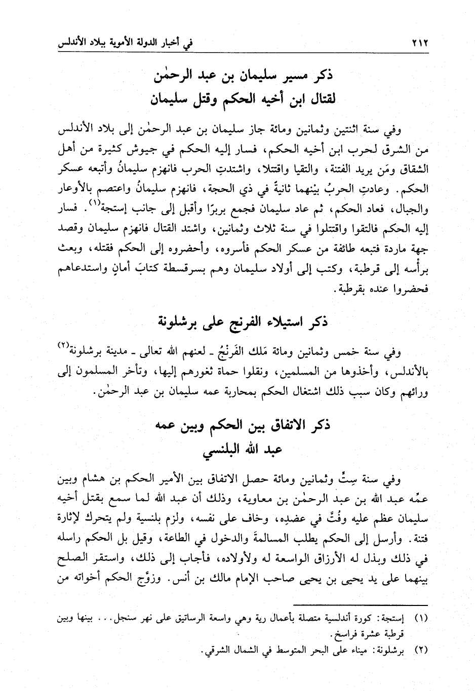وفي سنة خمس وثمانين ومائة ملَك الفرنج - لعنهم الله تعالى - مدينة برشلونة بالأندلس ، وأخذوها من المسلمين ، ونقلوا حماة ثغورهم إليها ، وتأخر المسلمون إلى ورائهم وكان سبب ذلك اشتغال الحكم بمحاربة عمه سليمان بن عبد الرحمن .