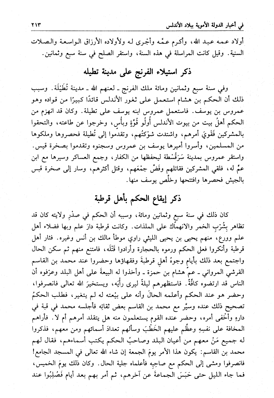 وفي سنة سبع وثمانين ومائة ملك الفرنج - لعنهم الله - مدينة تُطَيلة . وسبب ذلك أن الحكم بن هشام استعمل على ثغور الأندلس قائداً كبيراً من قواده وهو عمروس بن يوسف . فاستعمل عمروس ابنه يوسف على تطيلة . وكان قد انهزم من الحكم أهل بيت من بيوت الأندلس أولو قُوّة وبأسٍ ، وخرجوا عن طاعته ، والتحقوا بالمشركين فقيَ أمرهم ، واشتدت شوكتهم ، وتقدموا إلى تُطيلة فحصروها وملكوها من المسلمين ، وأسروا أميرها يوسف بن عمروس وسجنوه وتقدموا بصخرة قيس . واستقرّ عمروس بمدينة سرقسطة ليحفظها من الكفار ، وجمع العساكر وسيرها مع ابن عم له ، فلقي المشركين فقاتلهم وفَضّ جمْعهم ، وقتل أكثرهم ، وسار إلى صخرة قيس بالجيش فحصرها وافتتحها وخلّص يوسف منها .