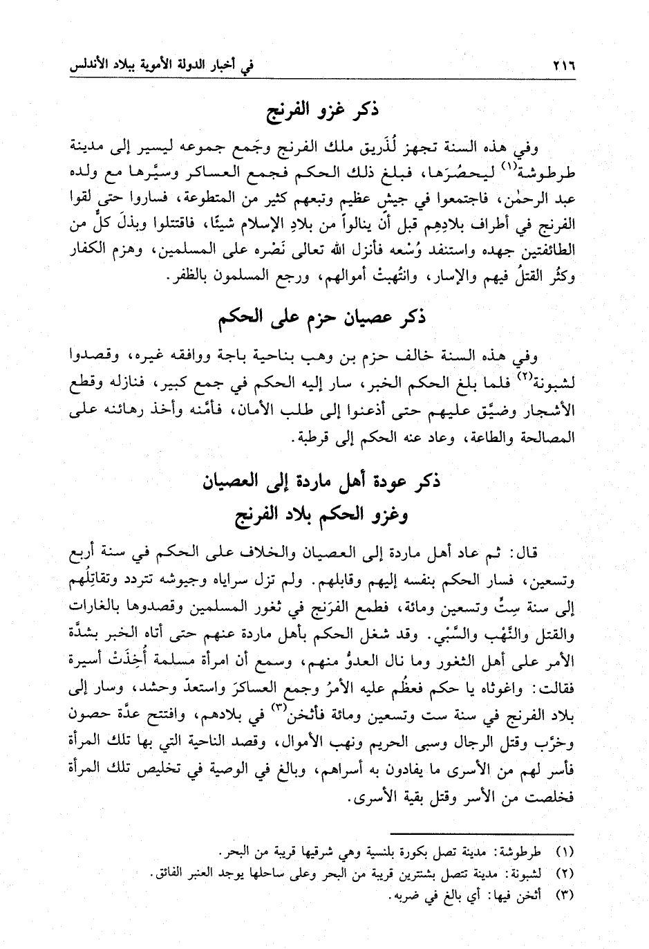 وفي هذه السنة تجهز لُذَريق ملك الفرنج وجمع جموعه ليسير إلى مدينة طرطوشة ليحصرها ، فبلغ ذلك الحكم فجمع العساكر وسيّرها مع ولده عبد الرحمن ، فاجتمعوا في جيش عظيم وتبعهم كثير من المتطوعة ، فساروا حتى لقوا الفرنج في أطراف بلادهم قبل أن ينالوا من بلاد الإسلام شيئاً ، فاقتتلوا وبذل كل من الطائفتين جهده واستنفد وسعه فأنزل الله تعالى نصره على المسلمين ، وهزم الكفار وكثُر القتل فيهم والإسار ، وانتُهبت أموالهم ، ورجع المسلمون بالظفر .