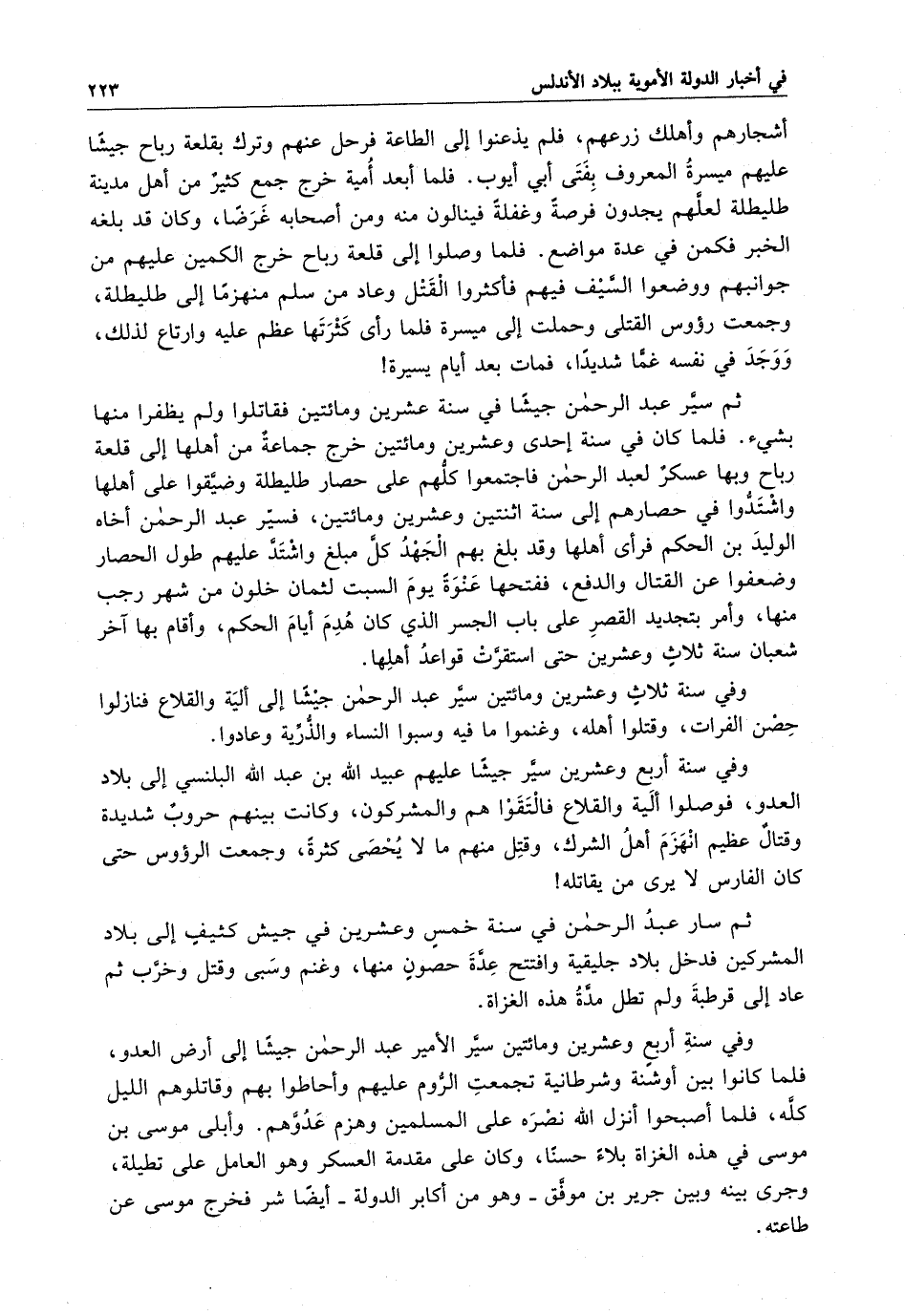 أشجارهم وأهلك زرعهم ، فلم يذعنوا إلى الطاعة فرحل عنهم وترك بقلعة رباح جيشاً عليهم ميسرة المعروف بفتى أبي أيوب . فلما أبعد أمية خرج جمع كثير من أهل مدينة طليطلة لعلّهم يجدون فرصةً وغفلةً فينالون منه ومن أصحابه غَرَضاً ، وكان قد بلغه الخبر فكمن في عدة مواضع . فلما وصلوا إلى قلعة رباح خرج الكمين عليهم من جوانبهم ووضعوا السيف فيهم فأكثروا القتل وعاد من سلم منهزماً إلى طليطلة ، وجمعت رؤوس القتلى وحملت إلى ميسرة فلما رأى كثرتها عظم عليه وارتاع لذلك ، ووجد في نفسه غمّاً شديداً ، فمات بعد أيام يسيرة ثم سيّر عبد الرحمن جيشاً في سنة عشرين ومائتين فقاتلوا ولم يظفروا منها بشيء . فلما كان في سنة إحدى وعشرين ومائتين خرج جماعةٌ من أهلها إلى قلعة رباح بها عسكر لعبد الرحمن فاجتمعوا كلهم على حصار طليطلة وضيّقوا على أهلها واشتدوا في حصارهم إلى سنة اثنتين وعشرين ومائتين ، فسيّر عبد الرحمن أخاه الوليد بن الحكم فرأى أهلها وقد بلغ بهم الجَهْد كلّ مبلغ واشتدّ عليهم طول الحصار وضعفوا عن القتال والدفع ، ففتحها عَنوةً يوم السبت لثمان خلون من شهر رجب منها ، وأمر بتجديد القصر على باب الجسر الذي كان هُدم أيام الحكم ، وأقام بها آخر شعبان سنة ثلاث وعشرين حتى استقرّت قواعد أهلها .
