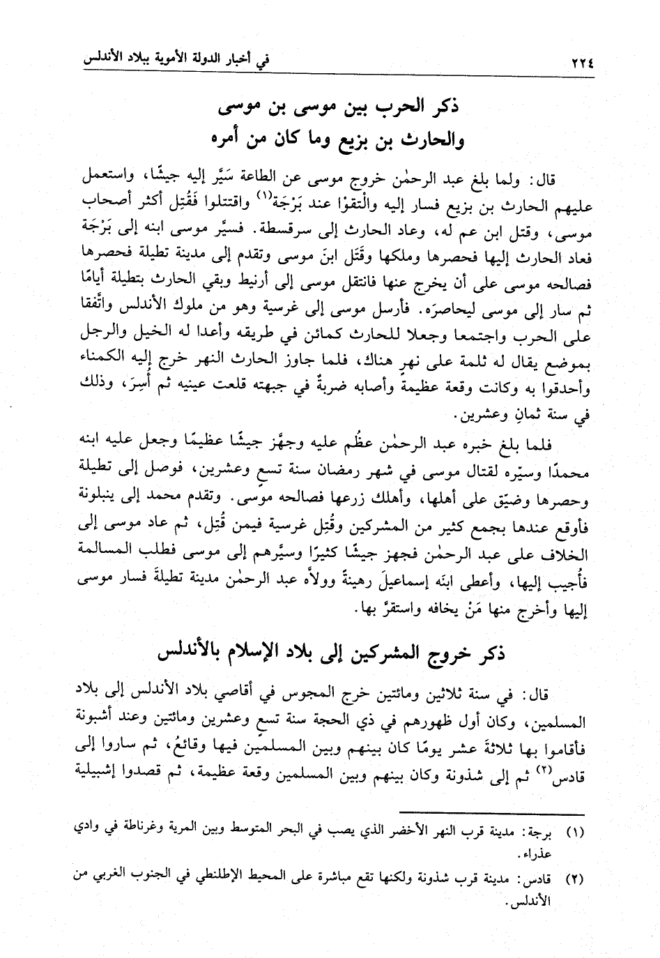قال : في سنة ثلاثين ومائتين خرج المجوس في أقاصي بلاد الأندلس إلى بلاد المسلمين ، وكان أول ظهورهم في ذي الحجة سنة تسع وعشرين ومائتين وعند أشبونة فأقاموا بها ثلاثة عشر يوماً كان بينهم وبين المسلمين فيها وقائع ، ثم ساروا إلى قادس ثم إلى شذونة وكان بينهم وبين المسلمين وقعة عظيمة ، ثم قصدوا إشبيلية