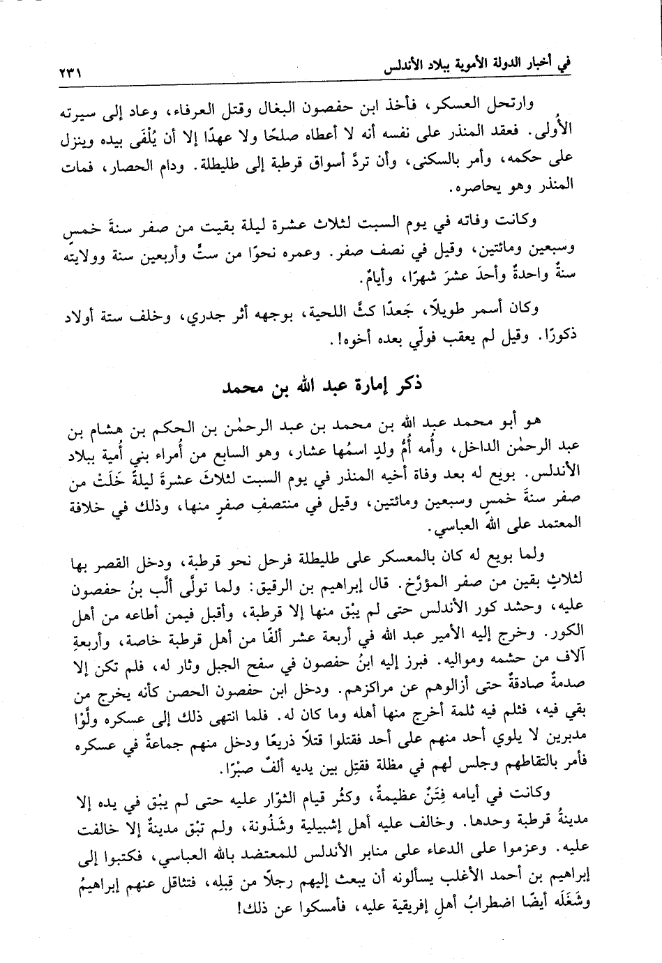 وكانت في أيامه فتنٌ عظيمة ، وكثُر قيام الثوّار عليه حتى لم يبق في يده إلا مدينة قرطبة وحدها . وخالف عليه أهل إشبيلية وشَذُونة ، ولم تبق مدينة إلا خالفت عليه . وعزموا على الدعاء على منابر الأندلس للمعتضد بالله العباسي ، فكتبوا إلى إبراهيم بن أحمد الأغلب يسألونه أن يبعث إليهم رجلاً من قٍبله ، فتثاقل عنهم إبراهيم وشغله أيضاً اضطراب أهل أفريقية عليه ، فأمسكوا عن ذلك