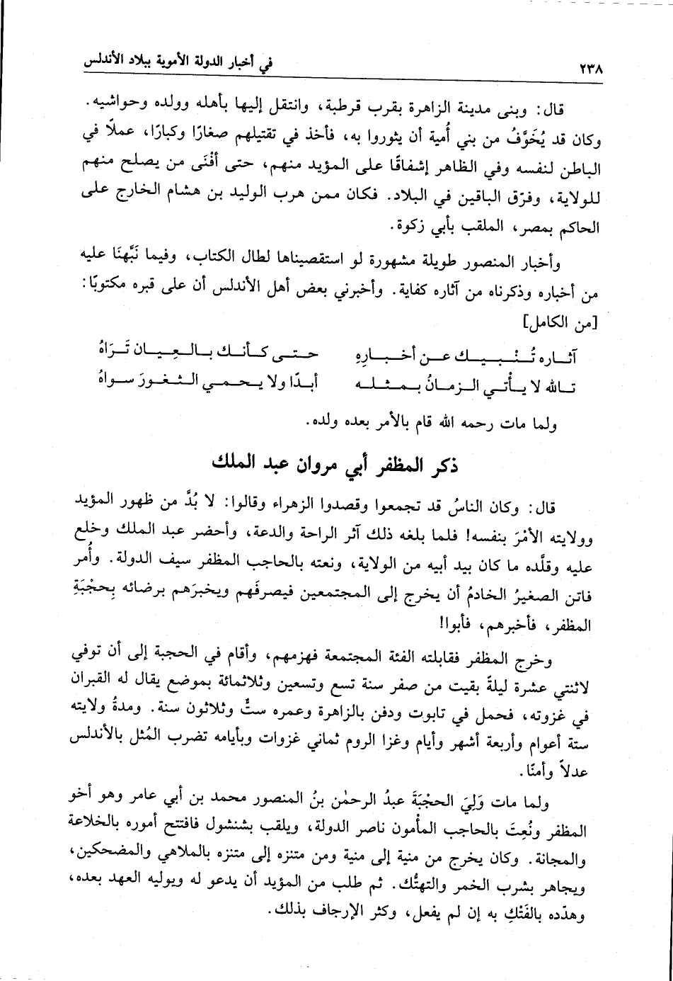 قال : وبنى مدينة الزاهرة بقرب قرطبة ، وانتقل إليها بأهله وولده وحواشيه . وكان قد يُخَوَّف من بني أمية أن يثوروا به ، فأخذ في تقتيلهم صغاراً وكباراً ، عملاً في الباطن لنفسه وفي الظاهر إشفاقاً على المؤيد منهم ، حتى أفنى من يصلح منهم للولاية ، وفرّق في البلاد . فكان ممن هرب الوليد بن هشام الخارج على الحاكم بمصر ، الملقب بأبي زكوة .