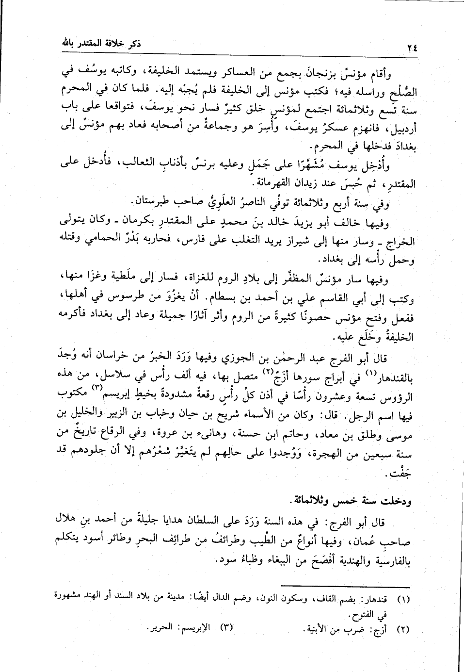 ودخلت سنة خمس وثلاثمائة : قال أبو الفرج : في هذه السنة ورد على السلطان هدايا جليلة من أحمد بن هلال صاحب عمان ، وفيها أنواع من الطيب وطرائف من طرائف البحر وطائر أسود يتكلم بالفارسية والهندية أفصح من الببغاء وظباء سود .